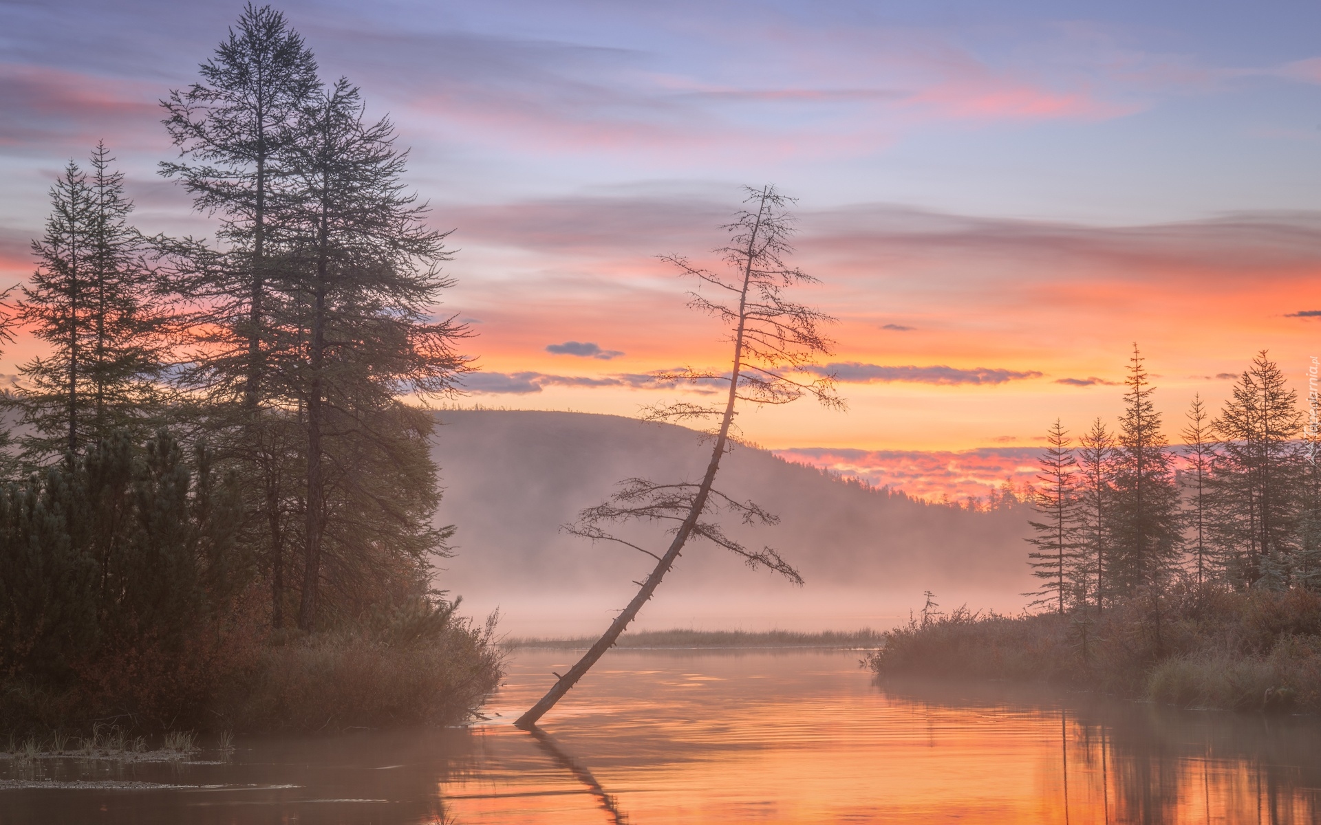 Edytor tapety: Kolorowe niebo nad zamglonym jeziorem Jack London