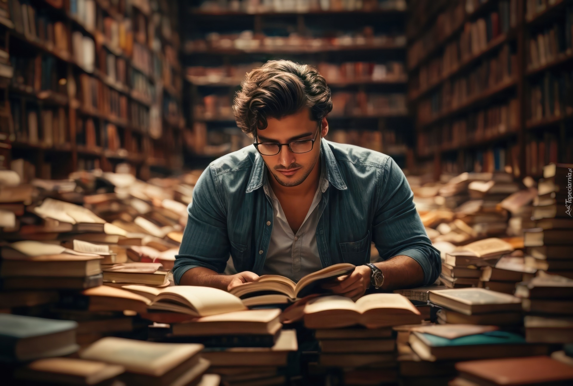 Edytor tapety: Mężczyzna czytający książkę w bibliotece