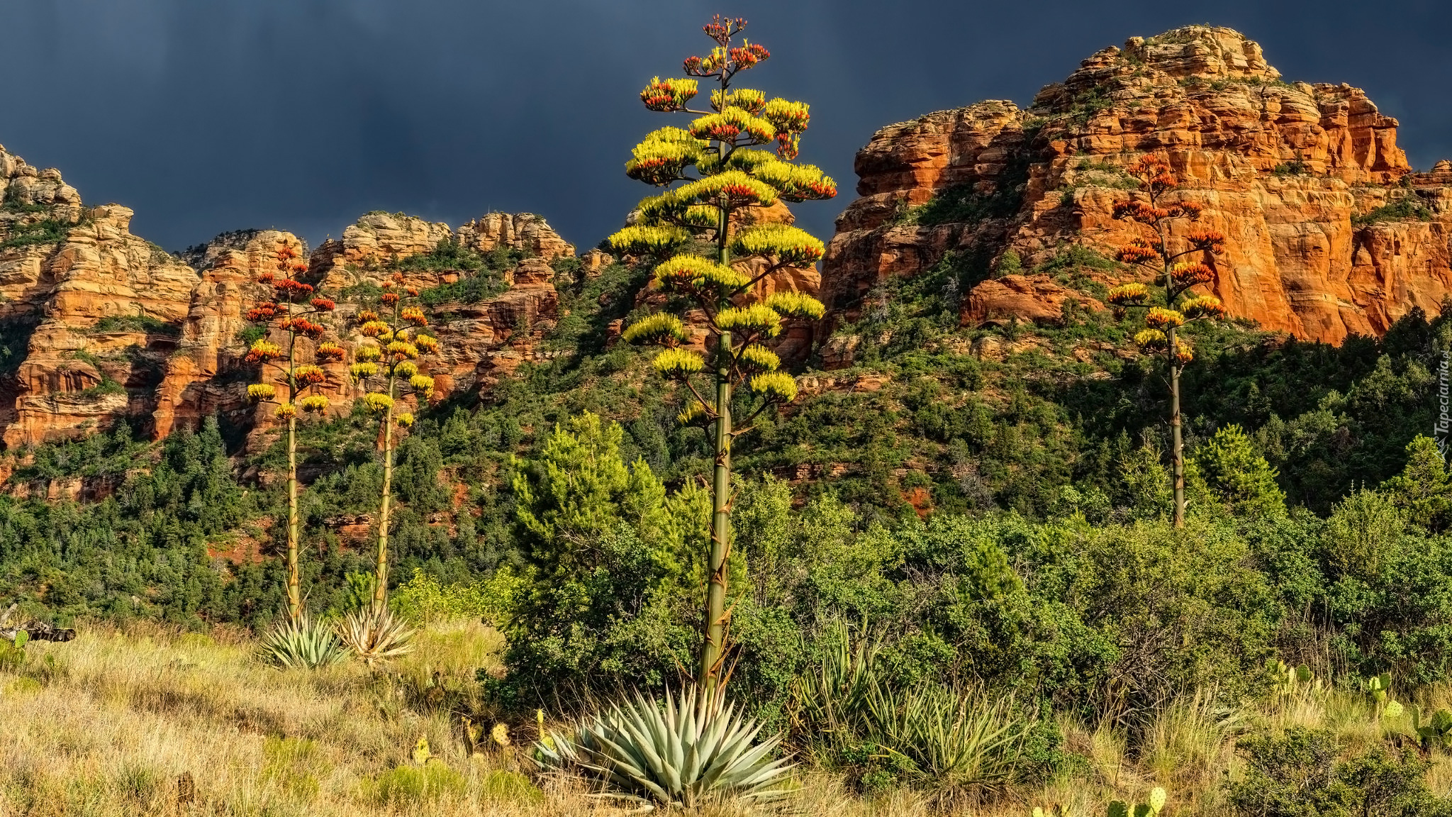 Edytor tapety: Agawy i drzewa przy skałach w Sedonie