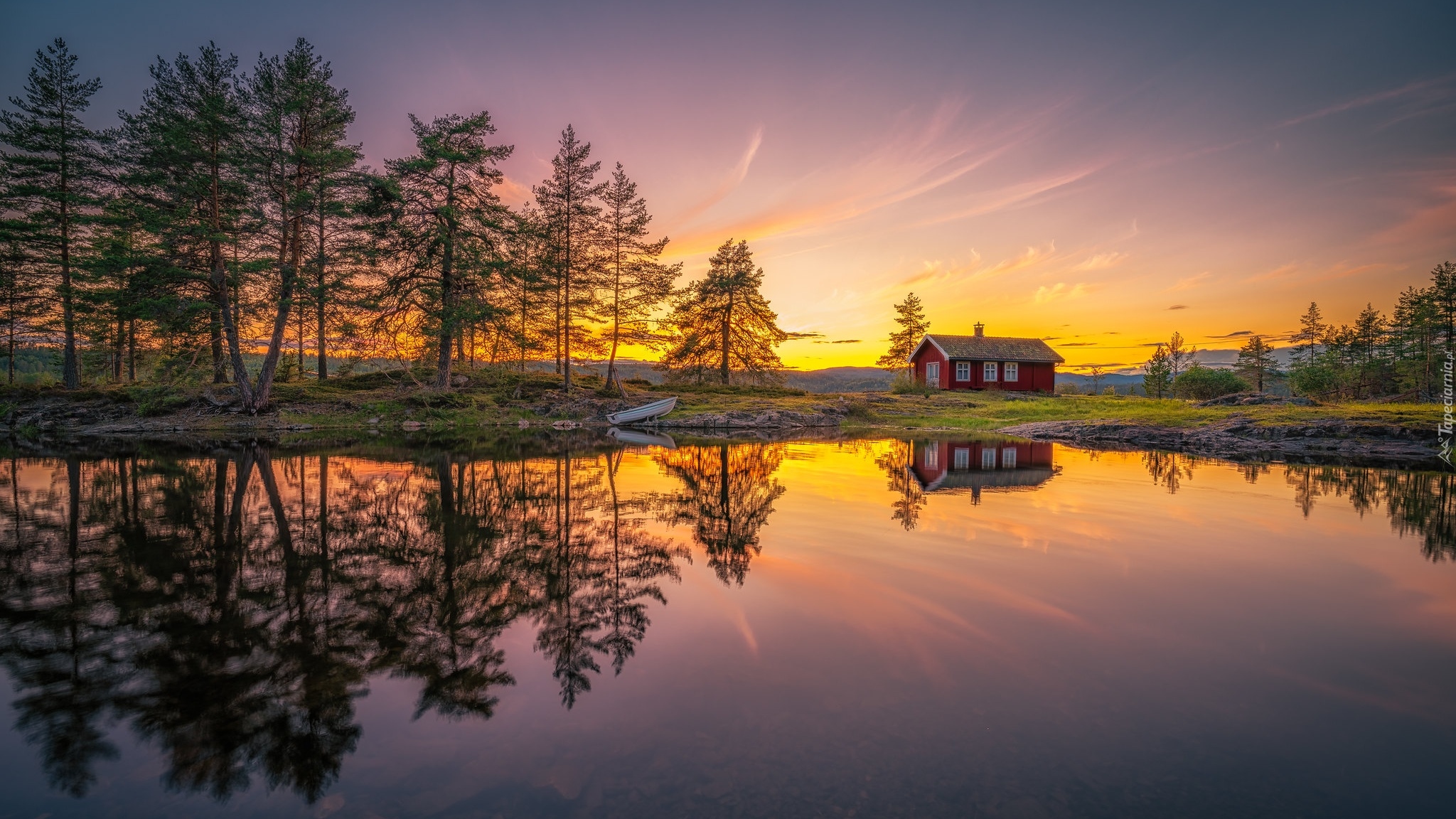 Edytor tapety: Domek i drzewa nad jeziorem Vaeleren o poranku