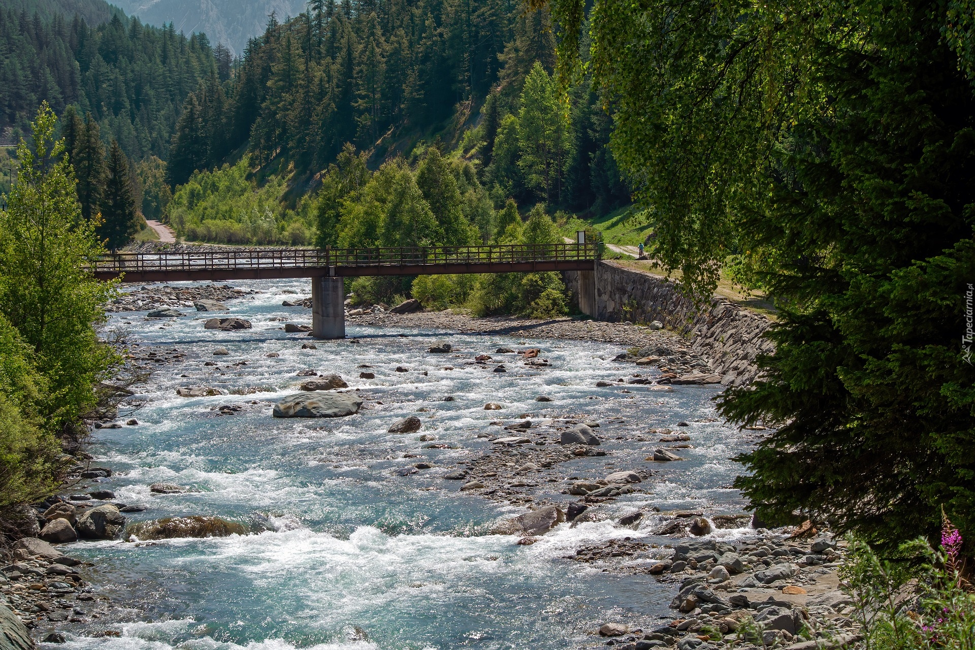 Edytor tapety: Drzewa przy moście nad rzeką w górach