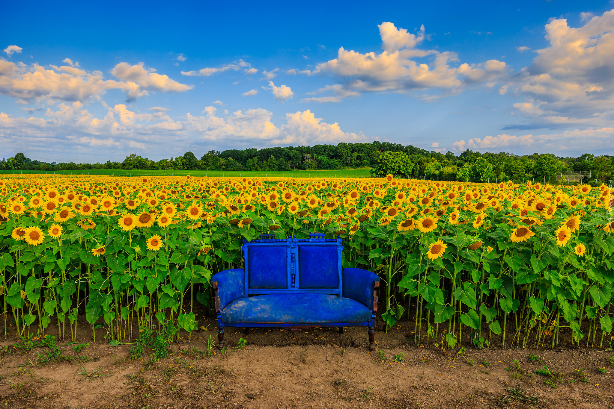 Edytor tapety: Niebieska kanapa na polu słoneczników