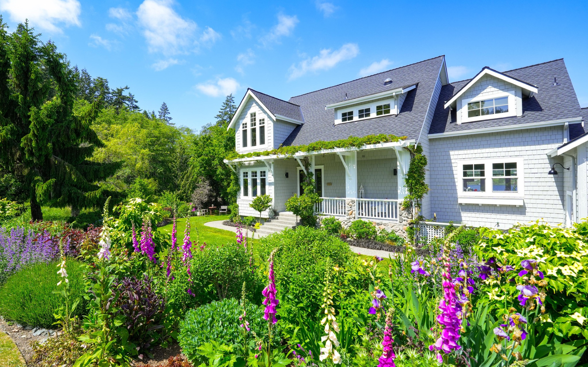 Edytor tapety: Kwiaty w ogrodzie i drzewa obok domu