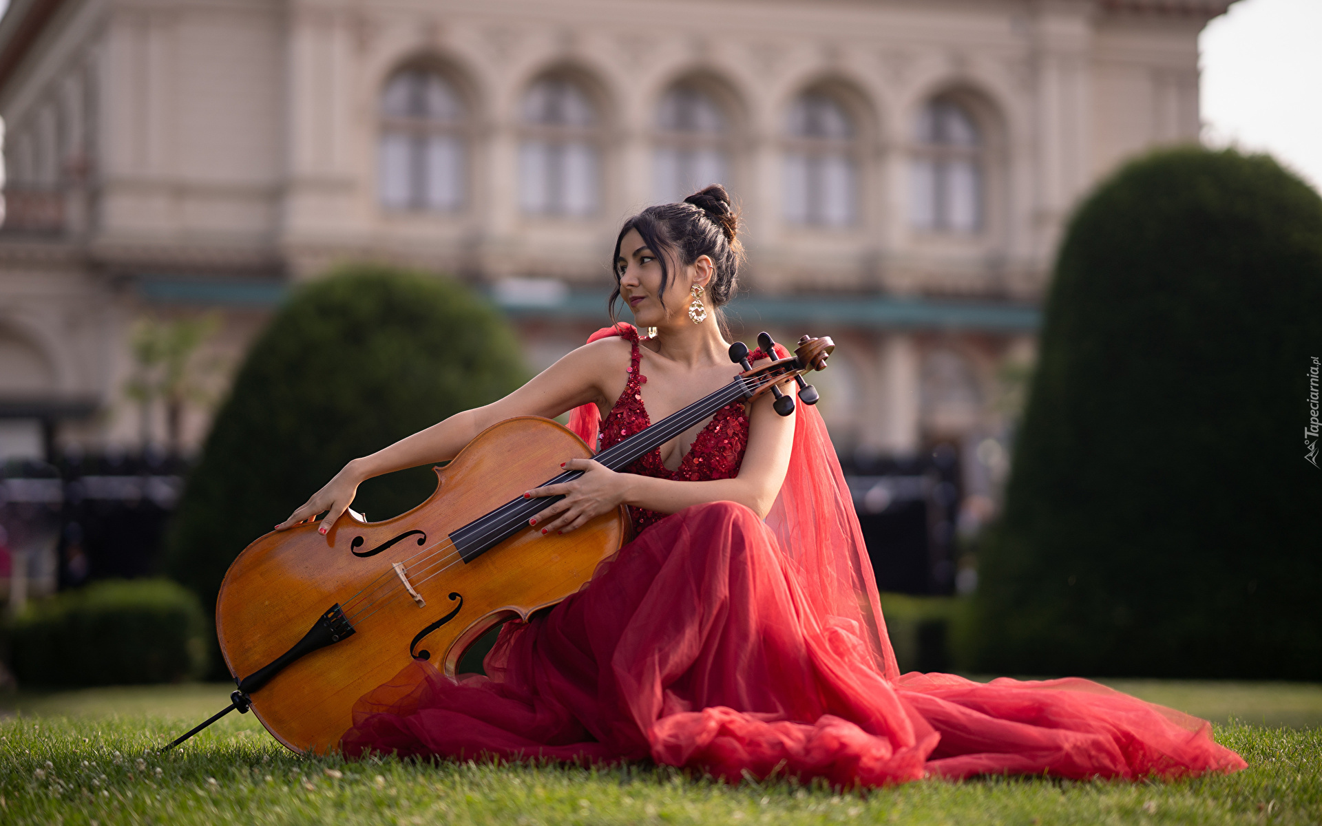 Edytor tapety: Kobieta w czerwonej sukni z wiolonczelą