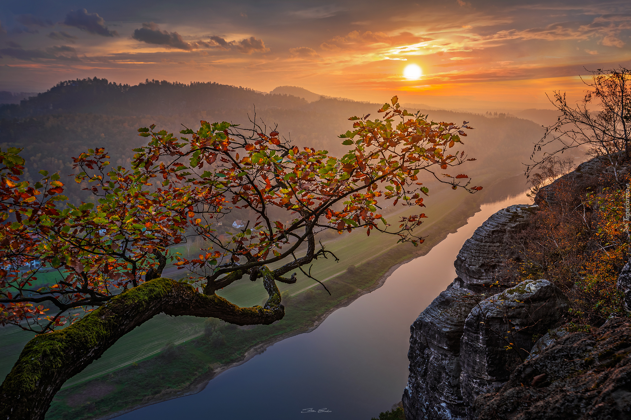 Edytor tapety: Widok na zachodzące słońce nad rzeką Łabą