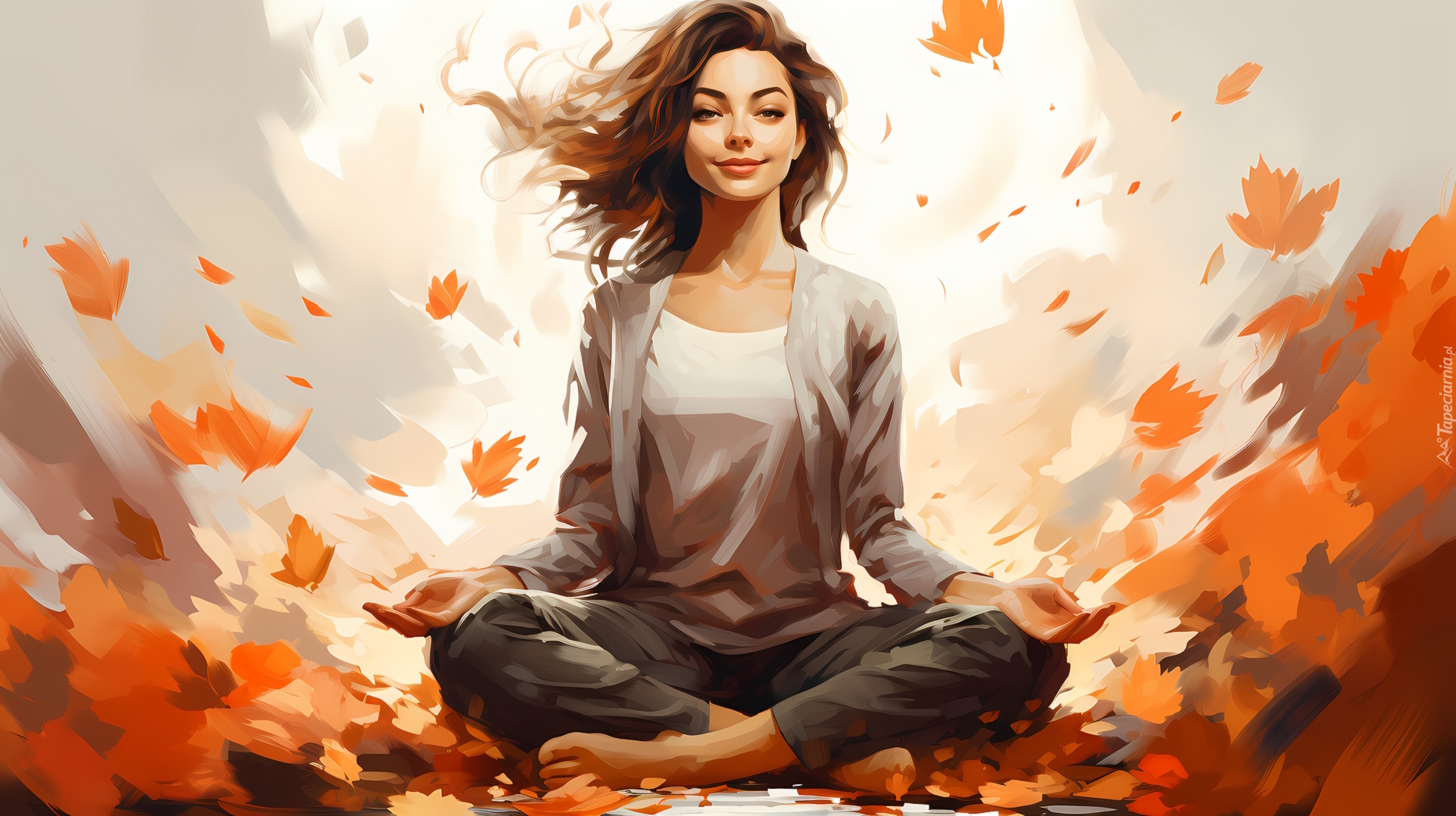 Edytor tapety: Kobieta ćwicząca jogę na jesiennych liściach
