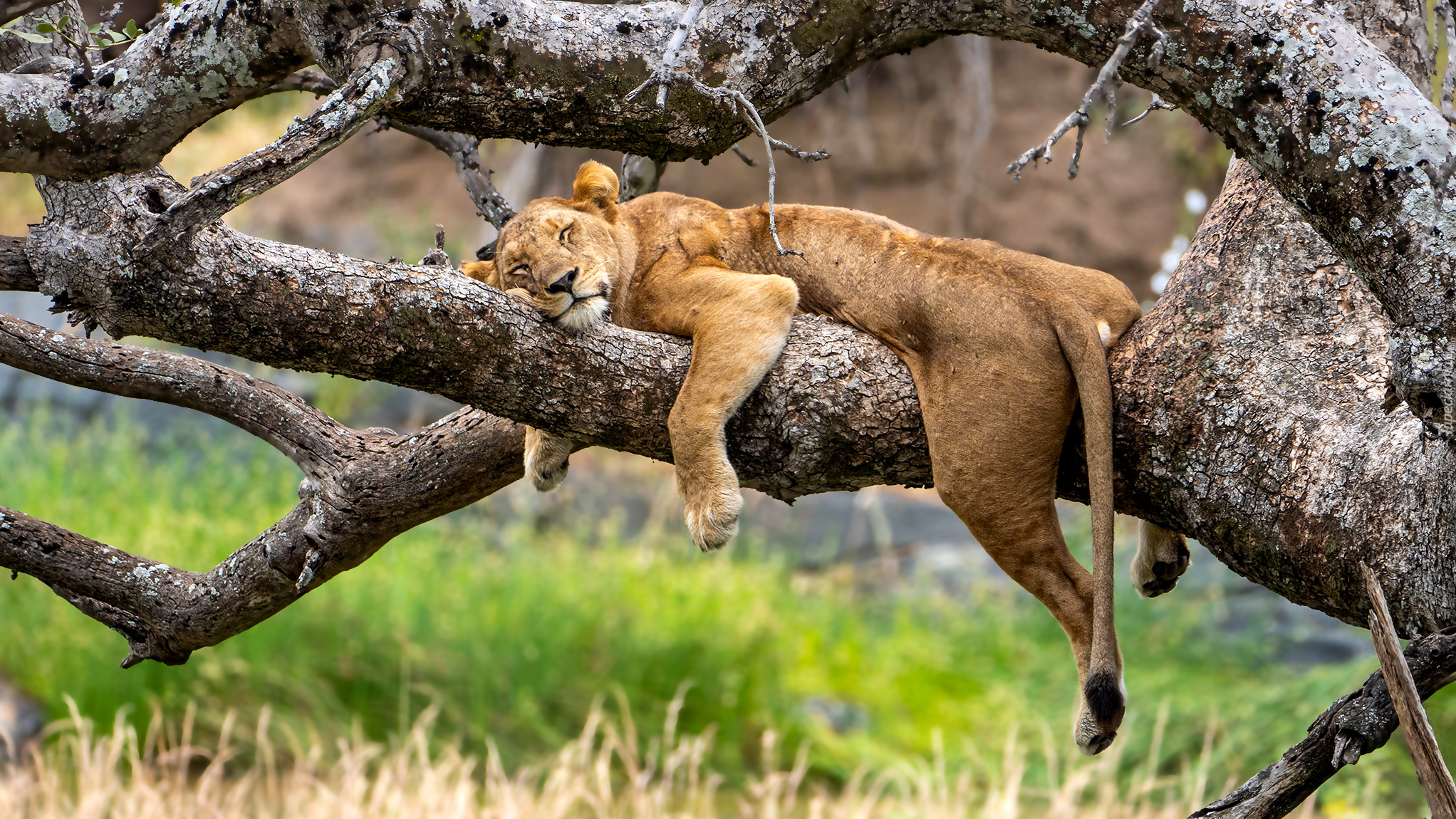 Edytor tapety: Lwica śpiąca na konarze drzewa