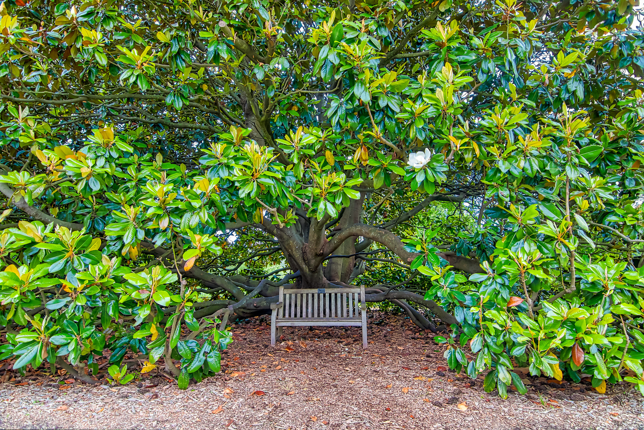 Edytor tapety: Drewniana ławka pod rozłożystym krzewem