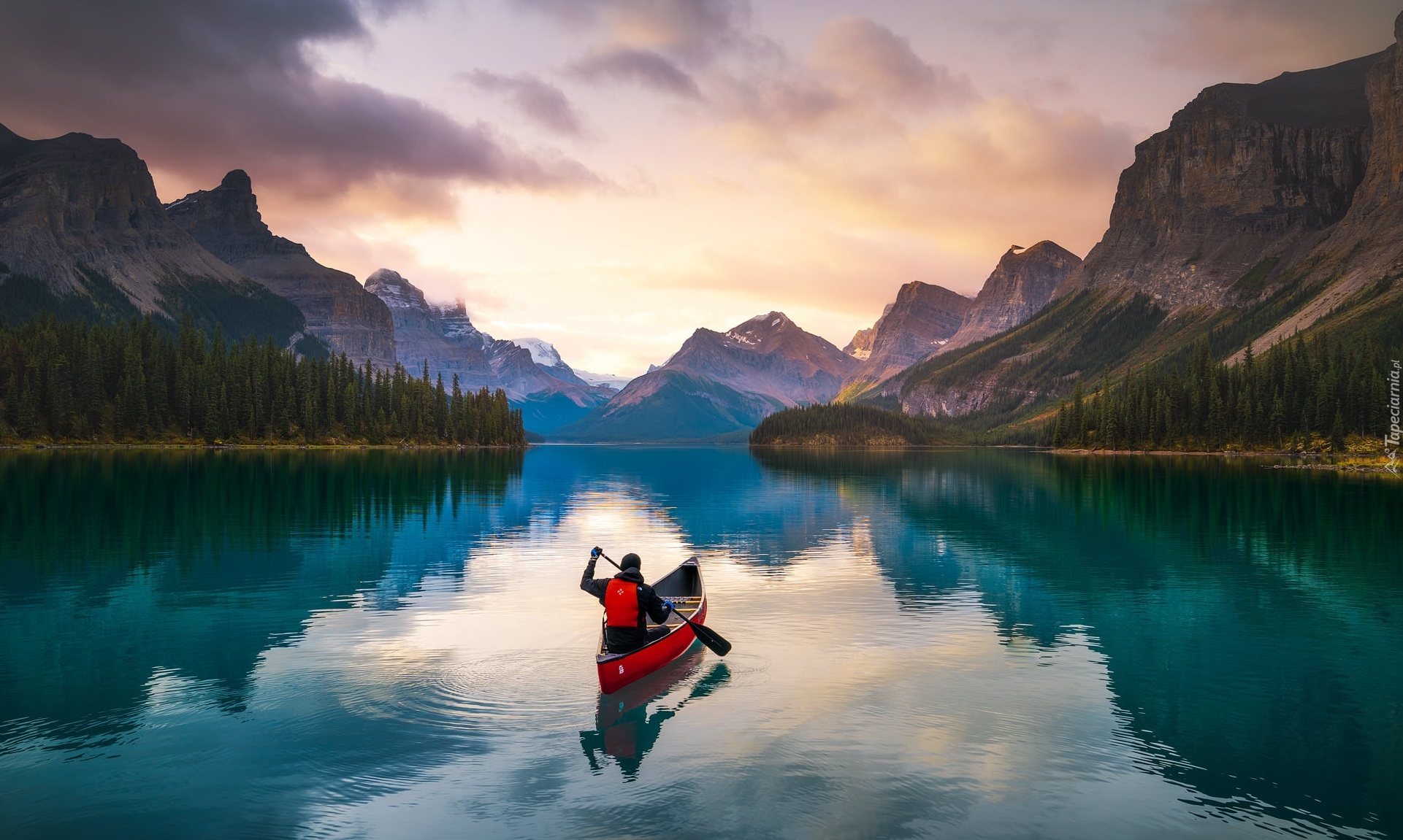 Edytor tapety: Kajakarz na górskim jeziorze Maligne Lake