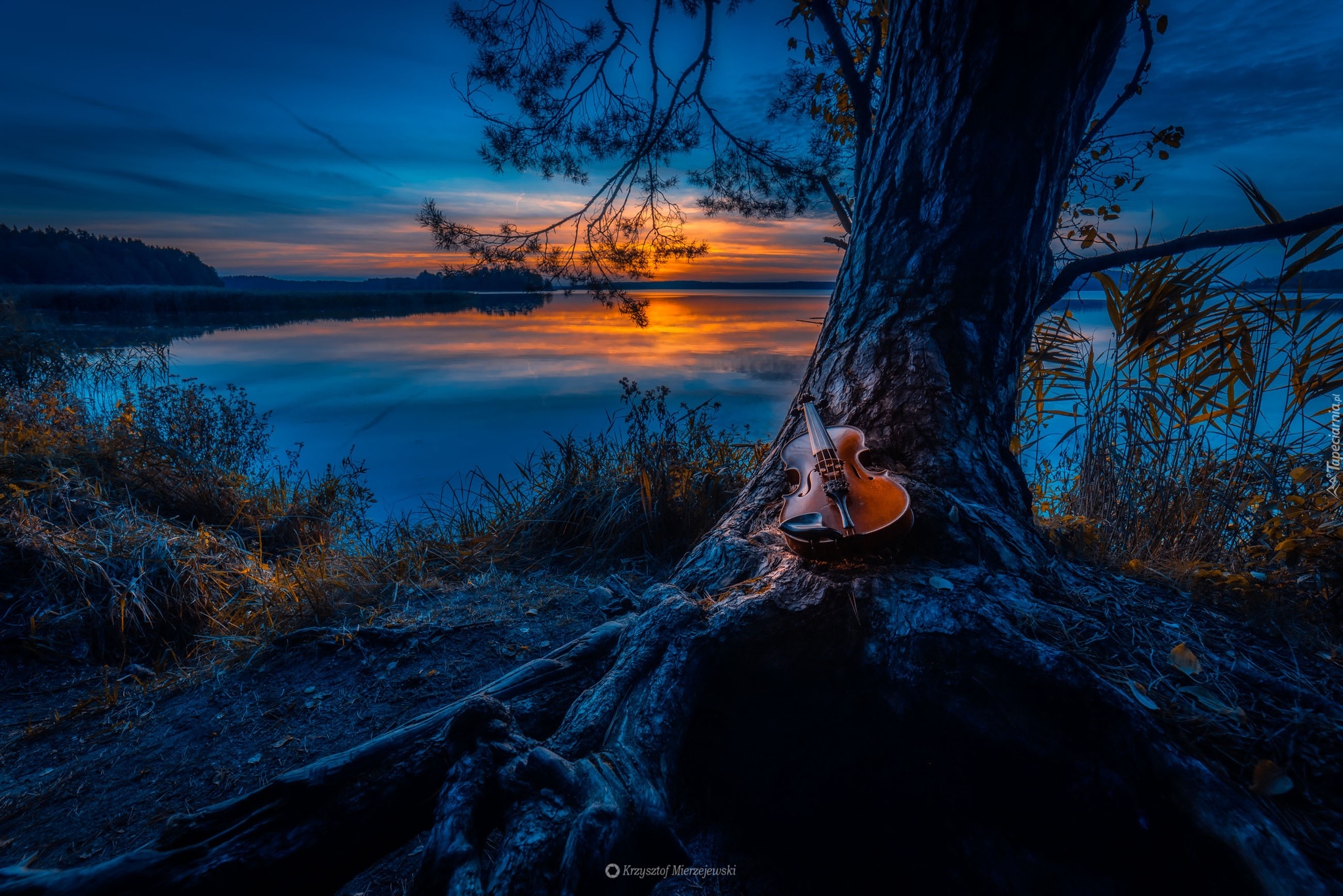 Edytor tapety: Skrzypce pod drzewem nad jeziorem w zapadającym zmroku