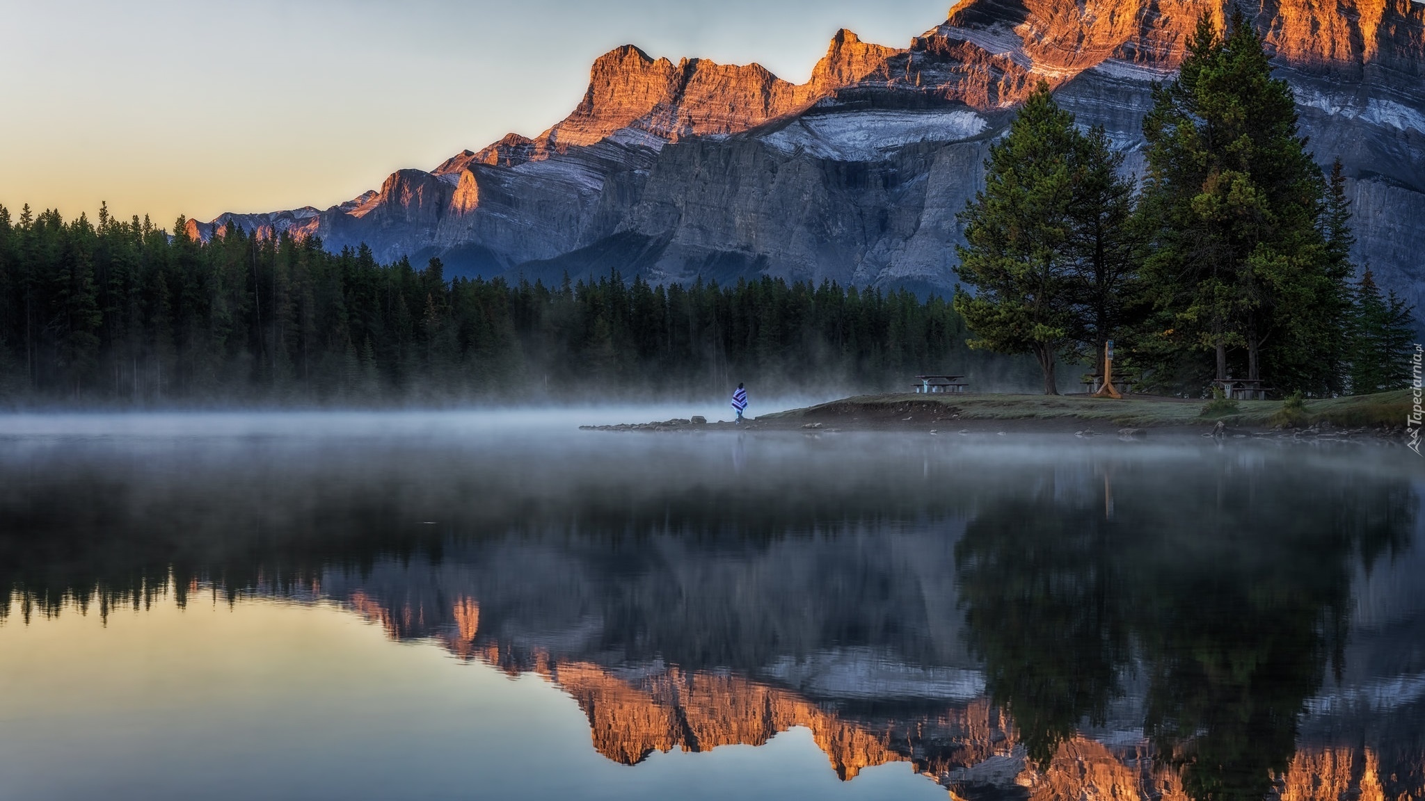 Edytor tapety: Rozświetlone góry i jezioro Two Jack Lake