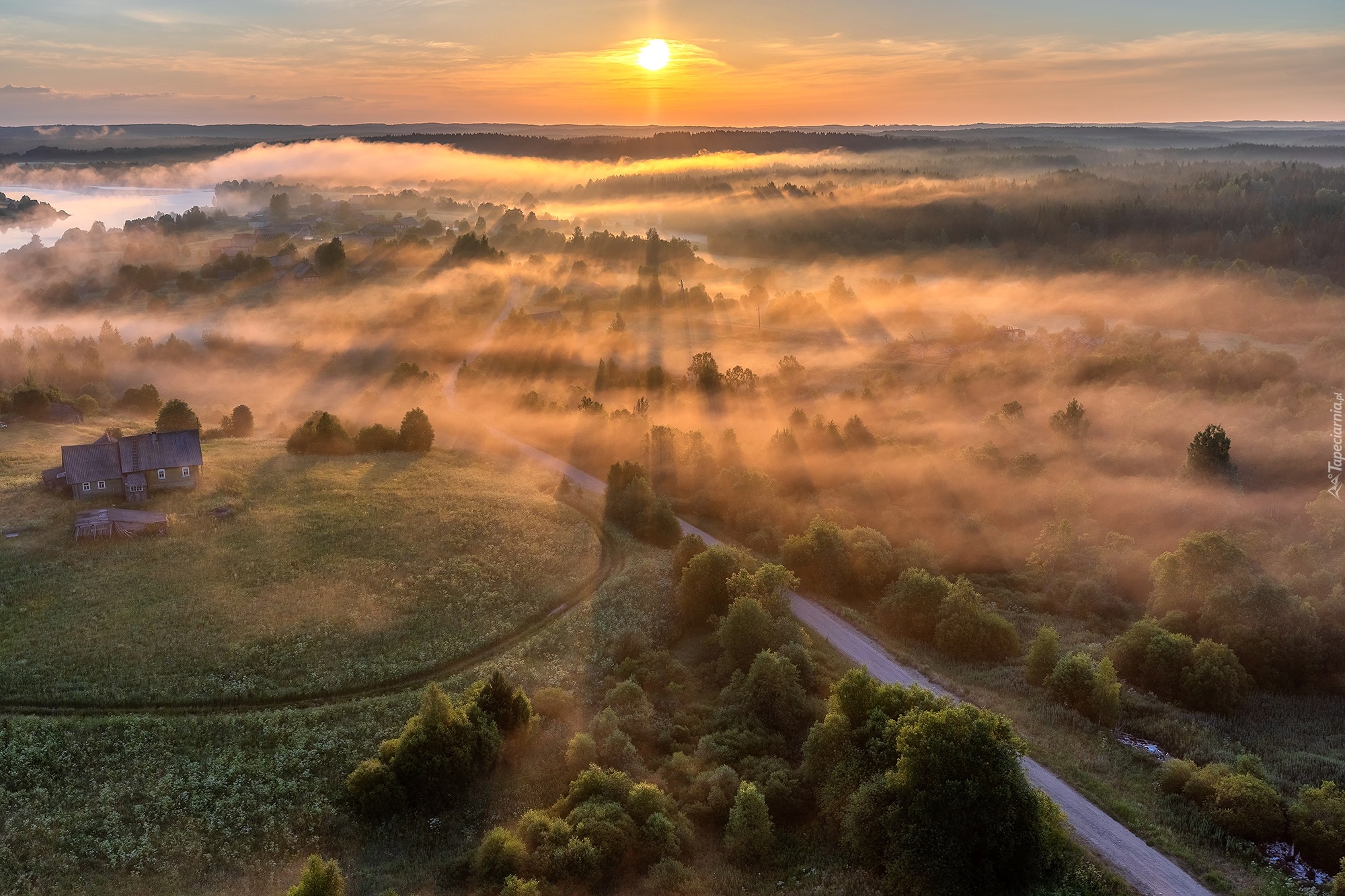 Edytor tapety: Rozświetlone promieniami słońca zamglone drzewa i domy