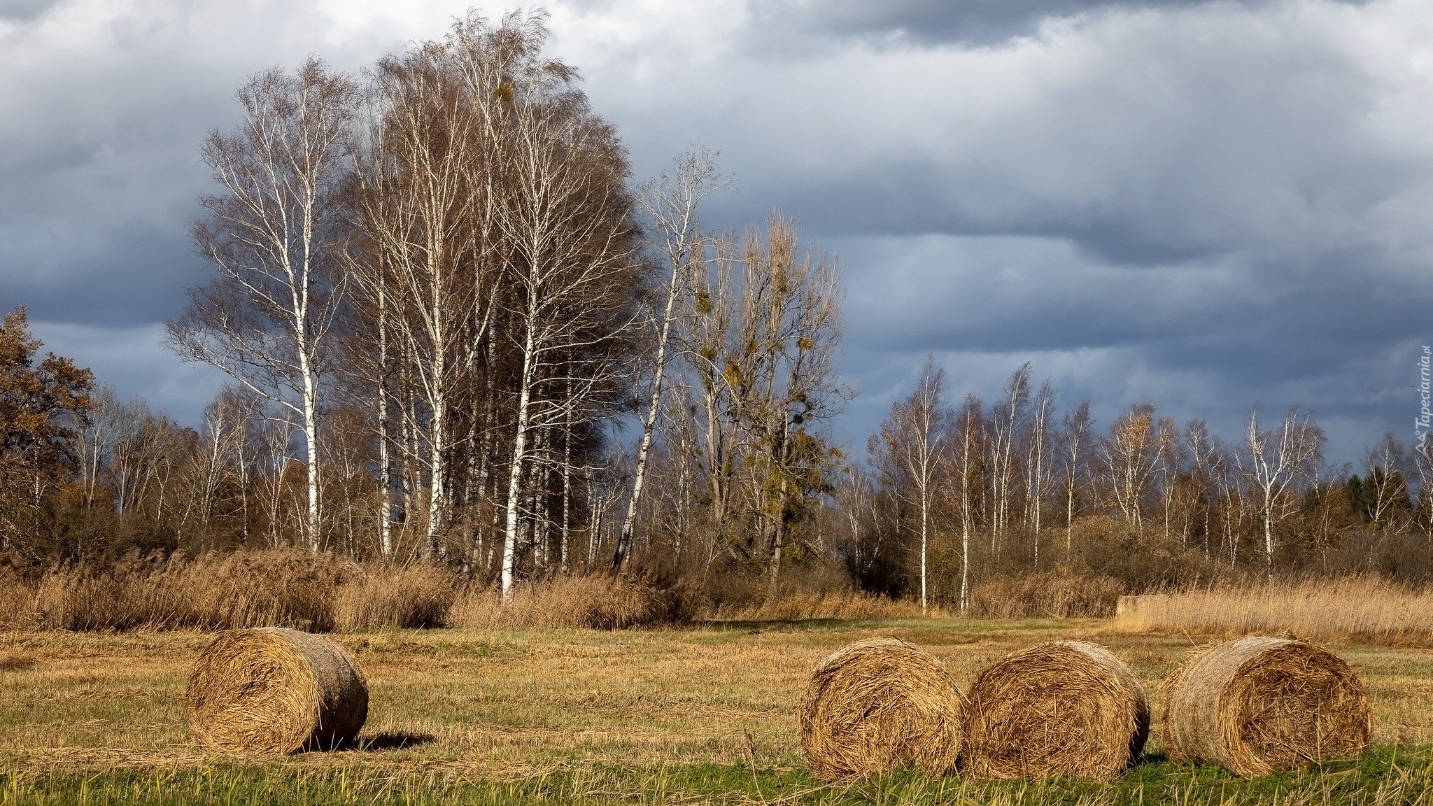 Edytor tapety: Bele słomy i brzozy na polu pod chmurami