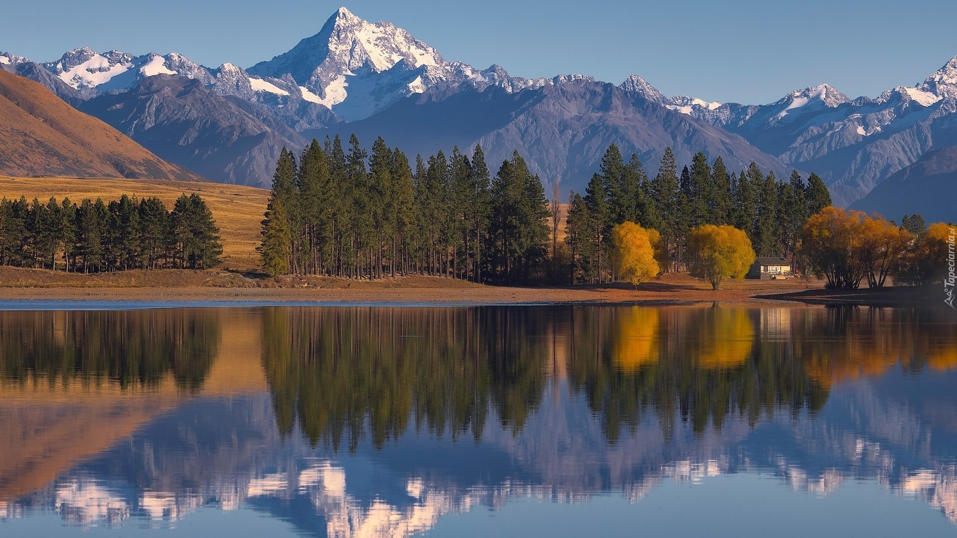 Edytor tapety: Odbicie ośnieżonych gór w jeziorze Lake Camp