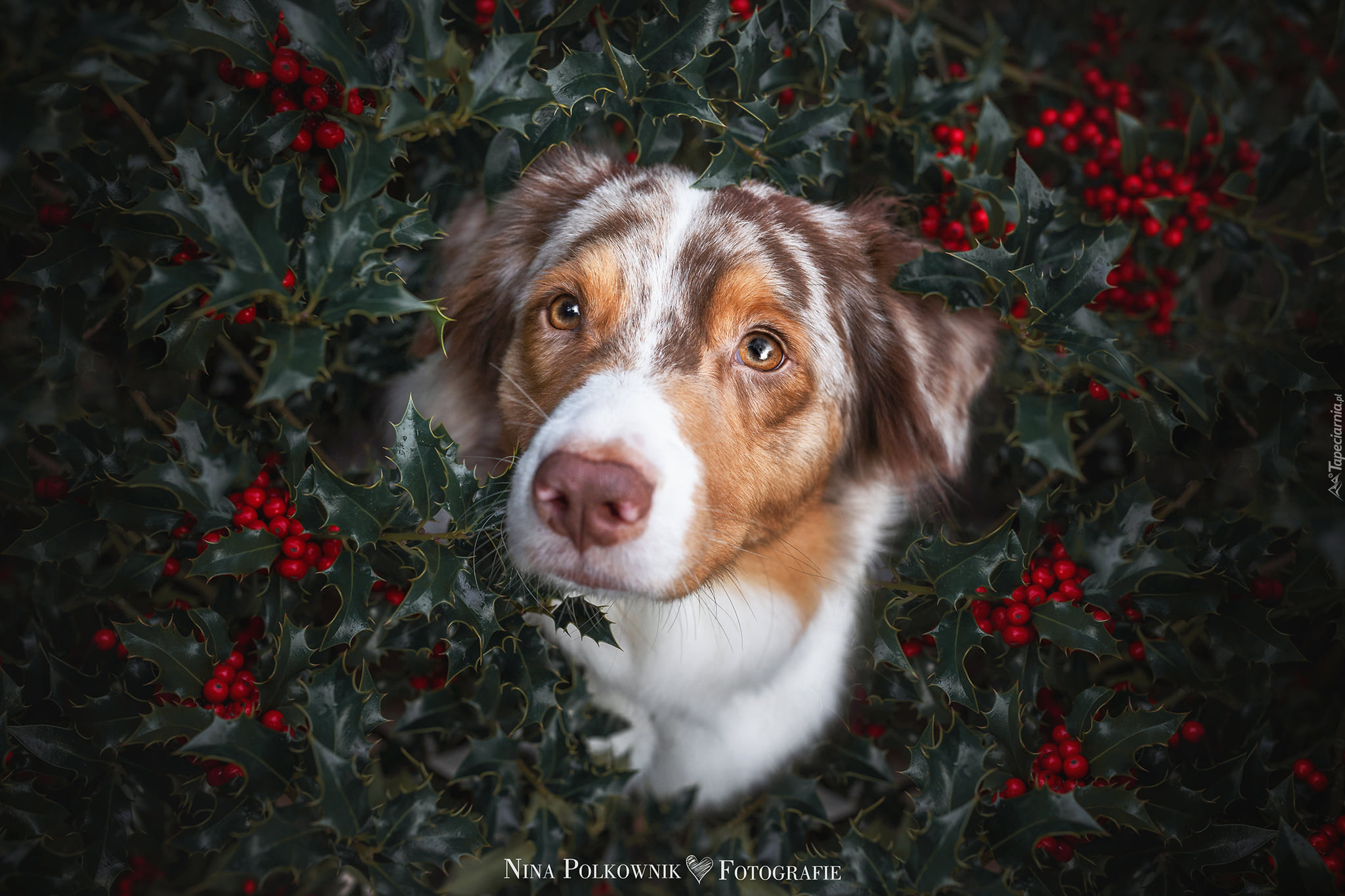 Edytor tapety: Owczarek australijski w ostrokrzewie