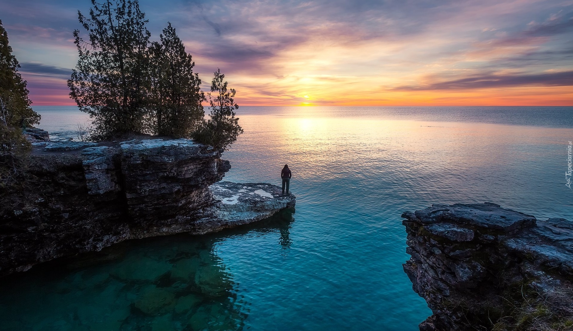 Edytor tapety: Człowiek na skale nad jeziorem o zachodzie słońca