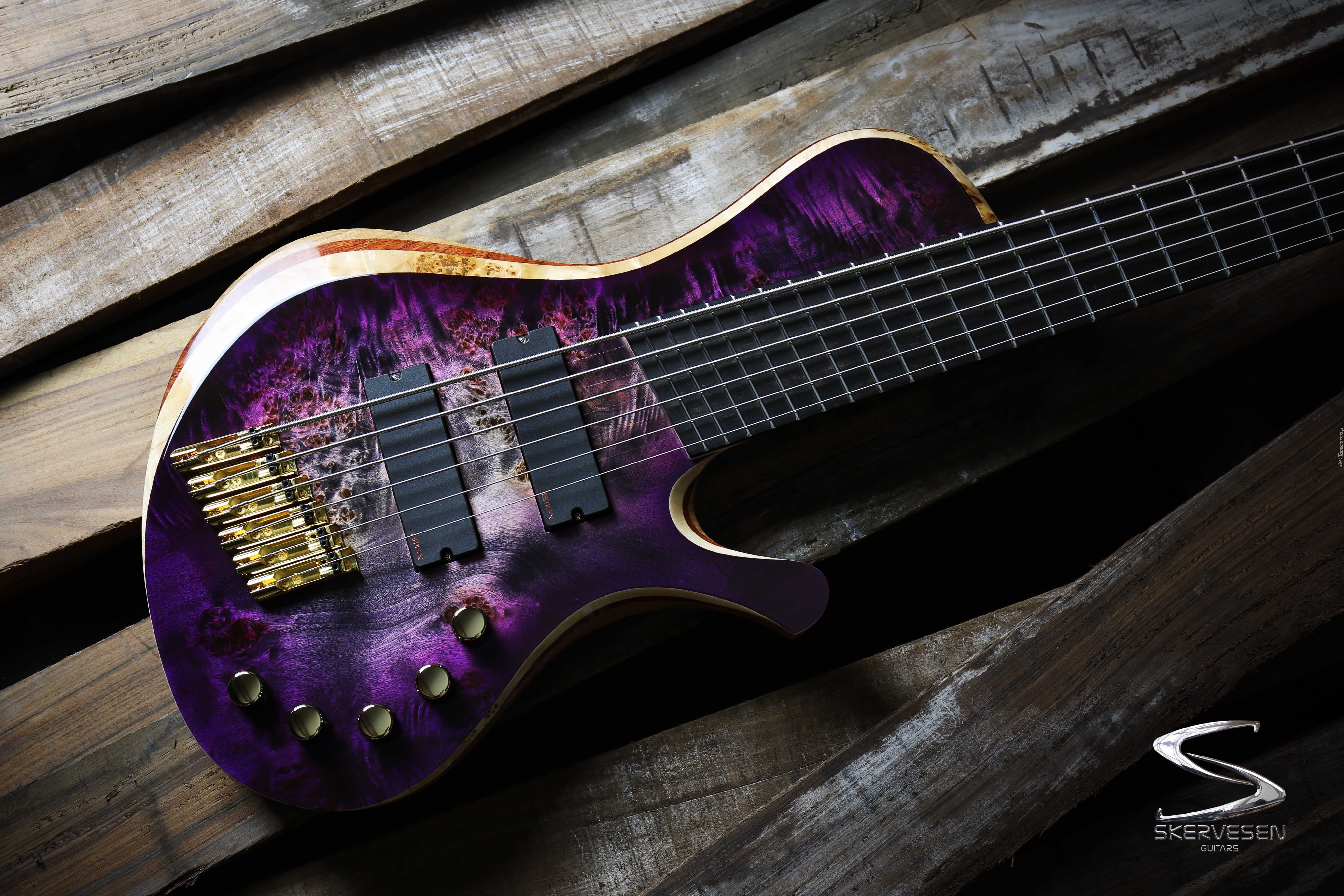 Edytor tapety: Fioletowa gitara basowa na deskach