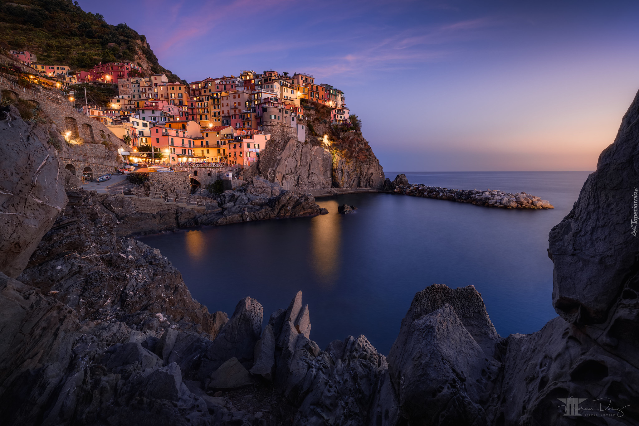 Edytor tapety: Oświetlone domy w Manaroli nad Morzem Liguryjskim