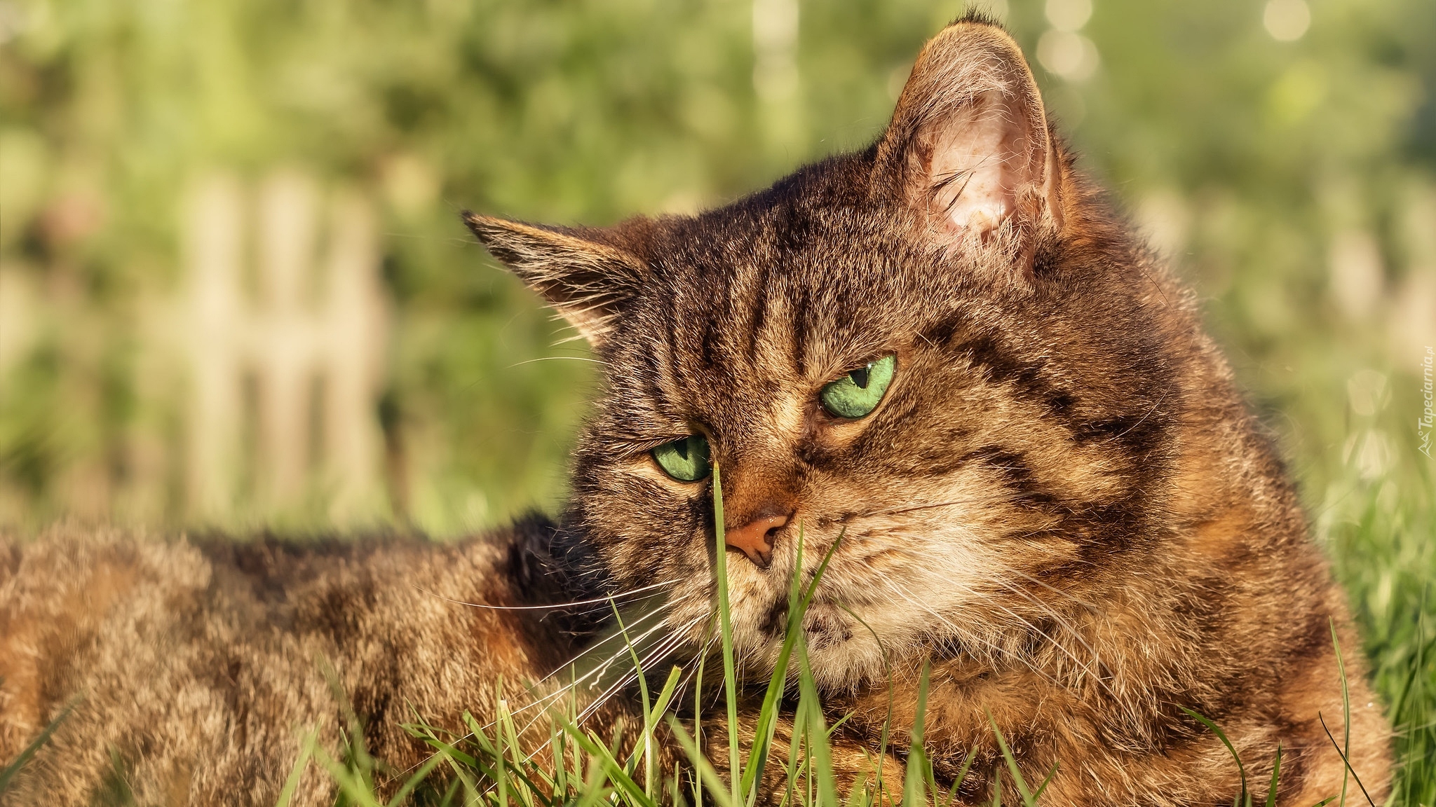 Edytor tapety: Zielonooki bury kot leżący w słońcu na trawie