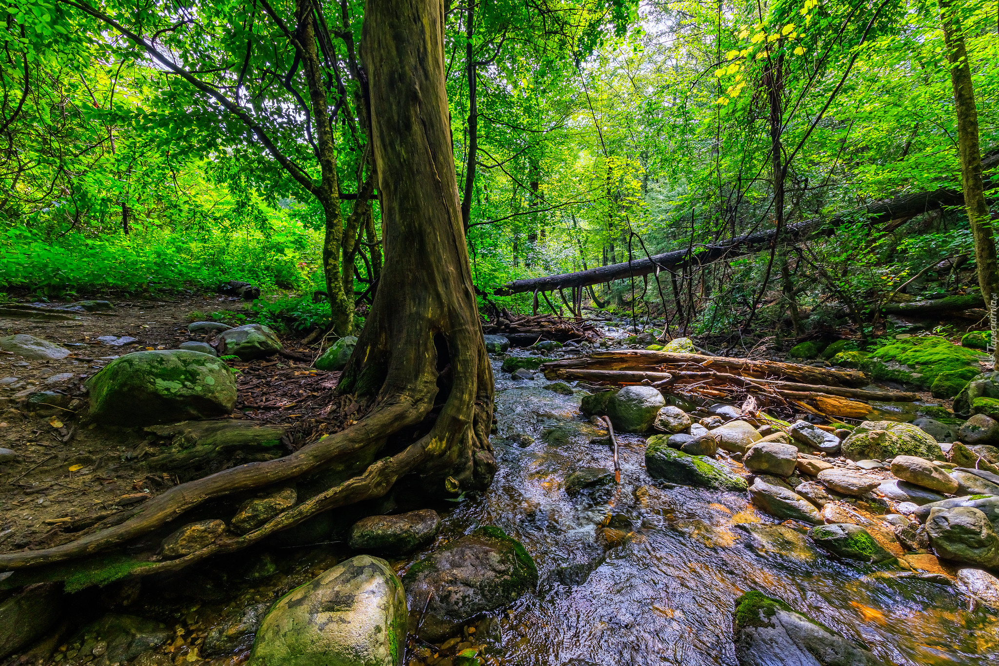 Edytor tapety: Kamienie i połamane drzewa nad leśnym strumieniem