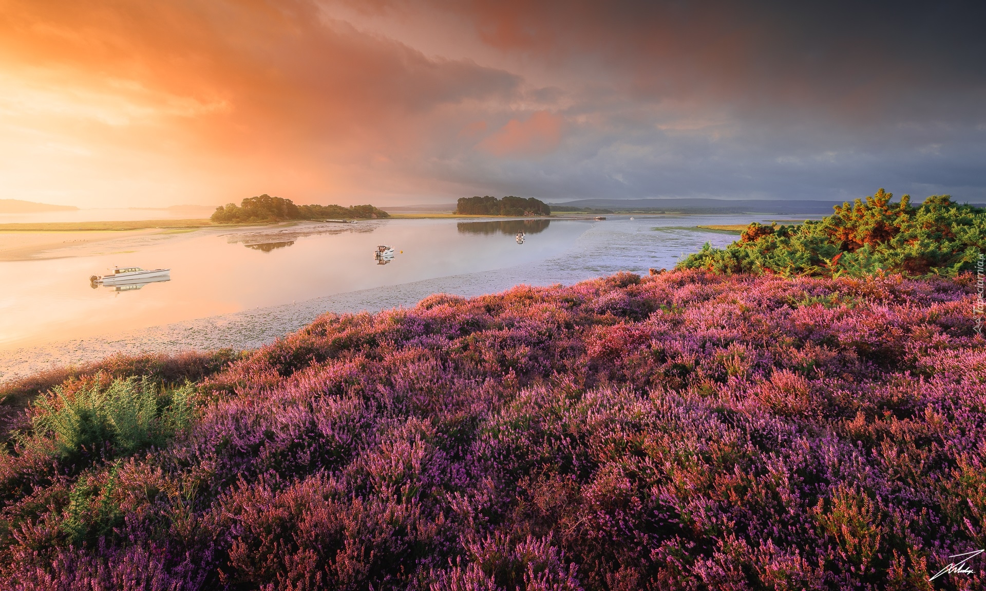 Edytor tapety: Kolorowe niebo nad wrzosowiskiem i jeziorem