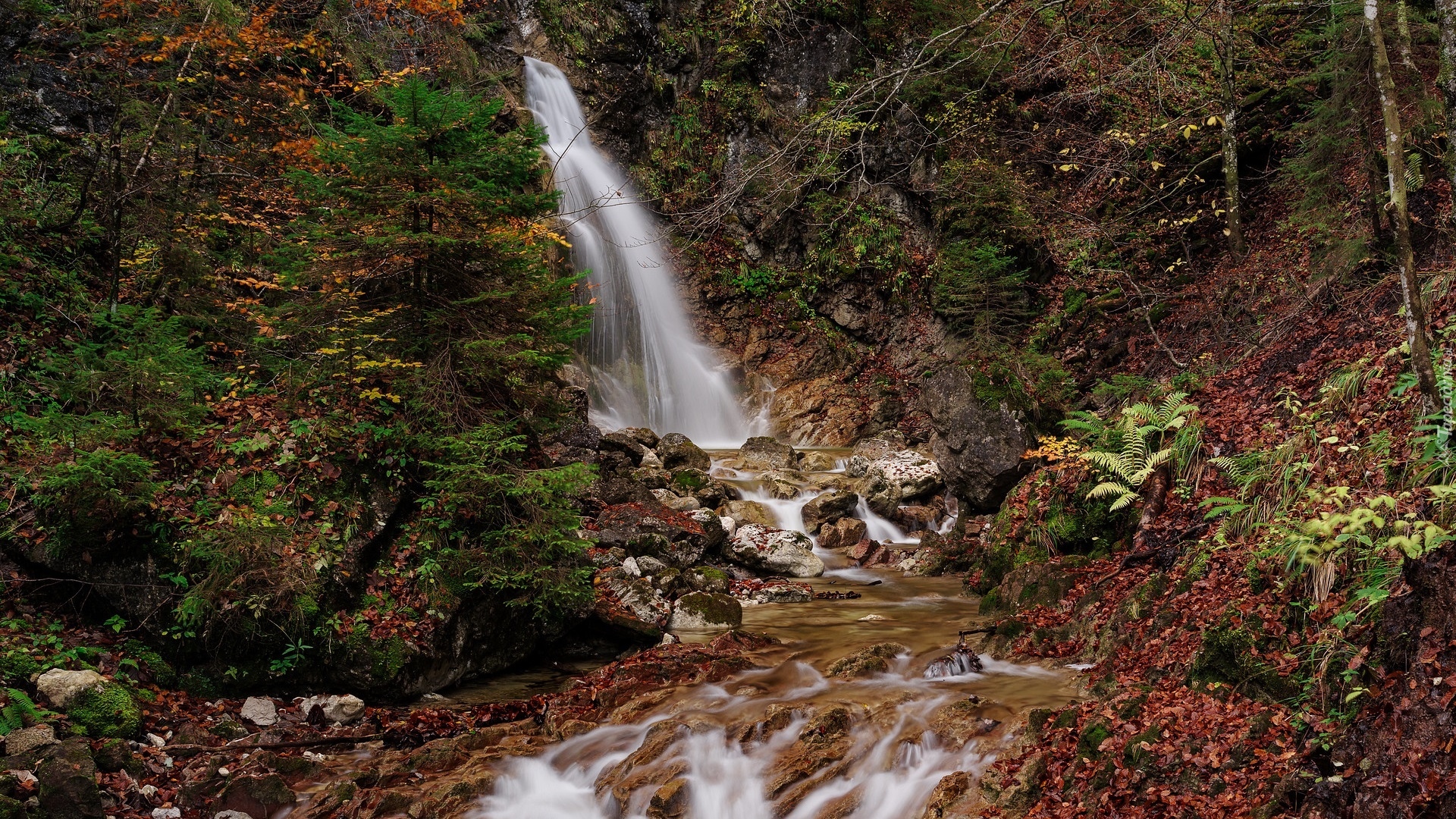 Edytor tapety: Drzewa i opadłe liście przy wodospadzie