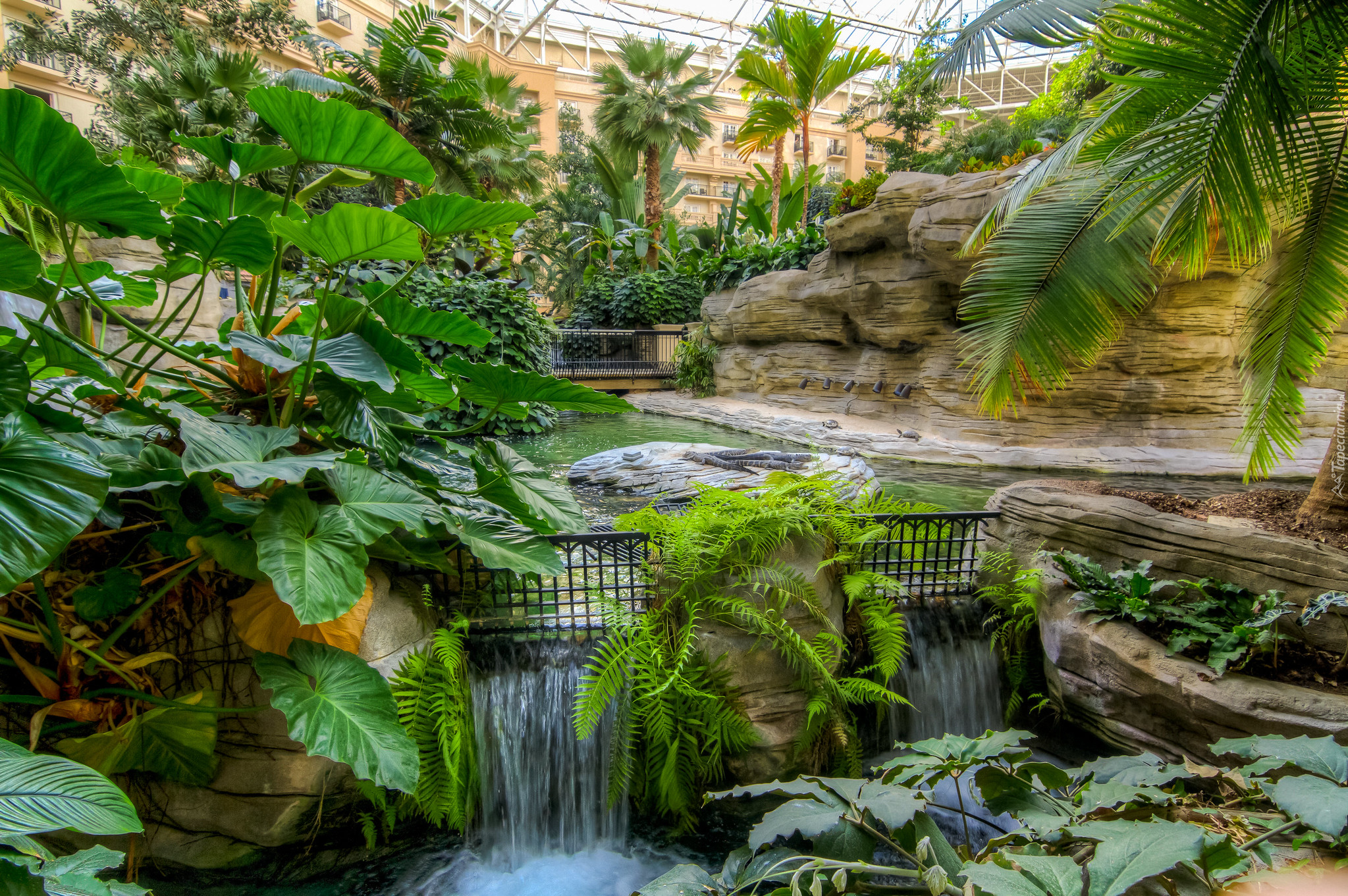 Edytor tapety: Skały i palmy przy wodospadzie w ogrodzie
