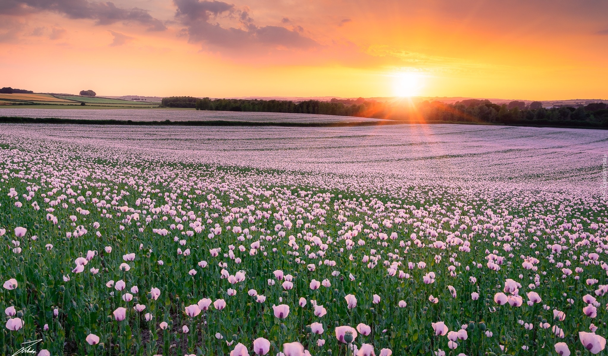 Edytor tapety: Wschód słońca nad polem różowych maków
