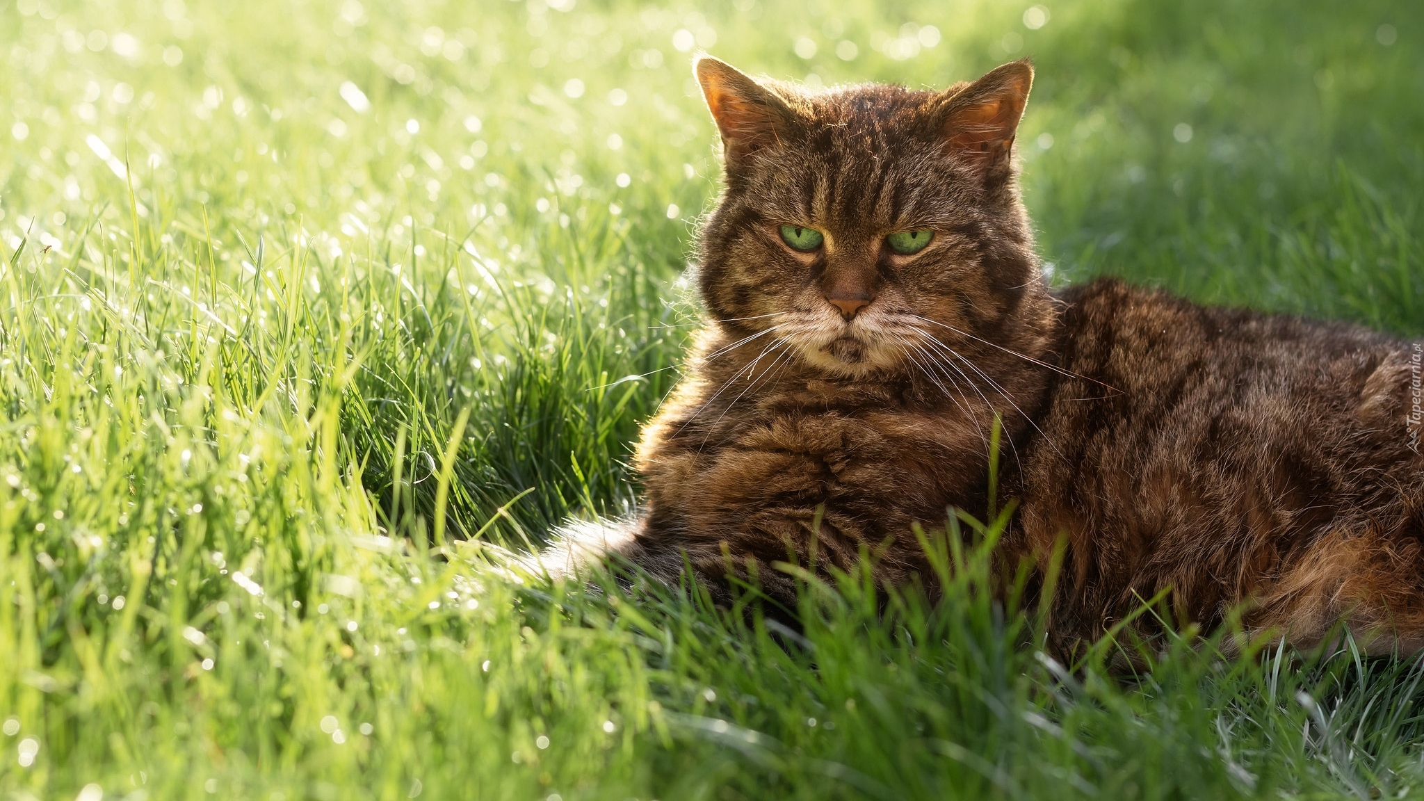 Edytor tapety: Bury kot w słońcu na trawie