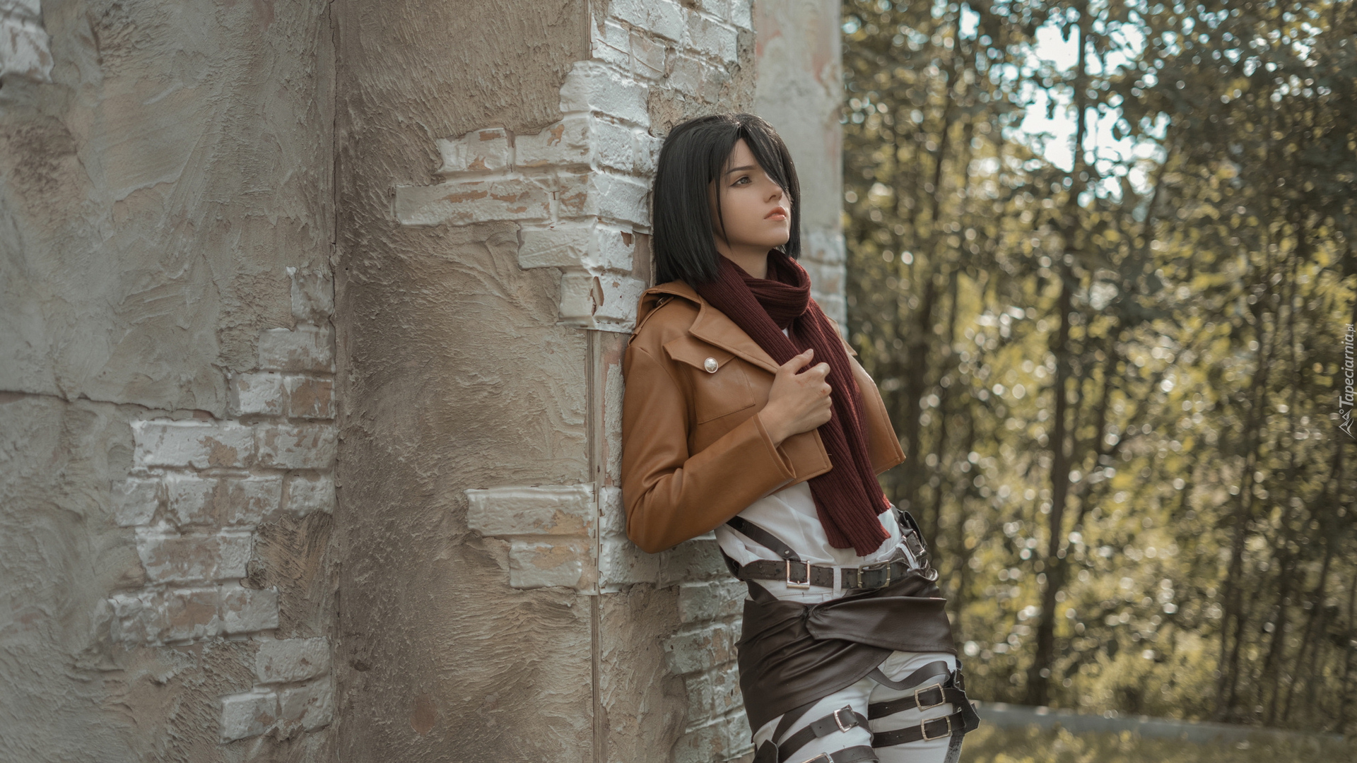 Edytor tapety: Dziewczyna w skórzanej kurtce oparta o mur