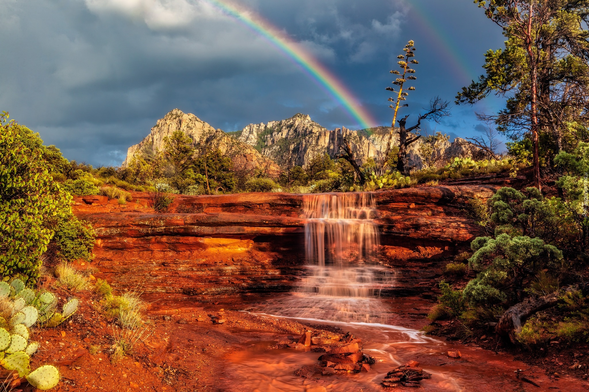 Edytor tapety: Wodospad i tęcza nad górą Munds w Sedonie