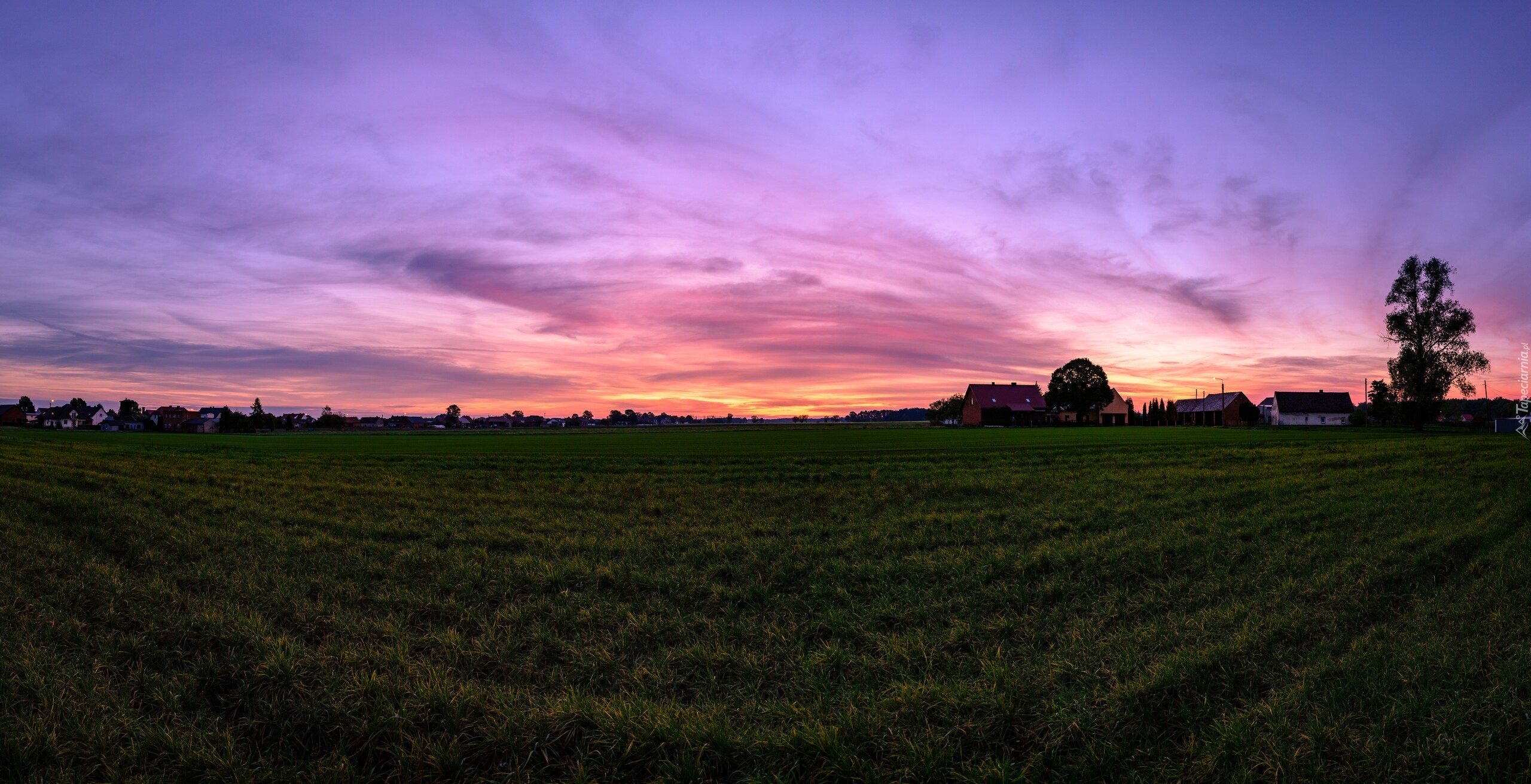 Edytor tapety: Kolorowe niebo wschodzącego słońca nad polami i domami