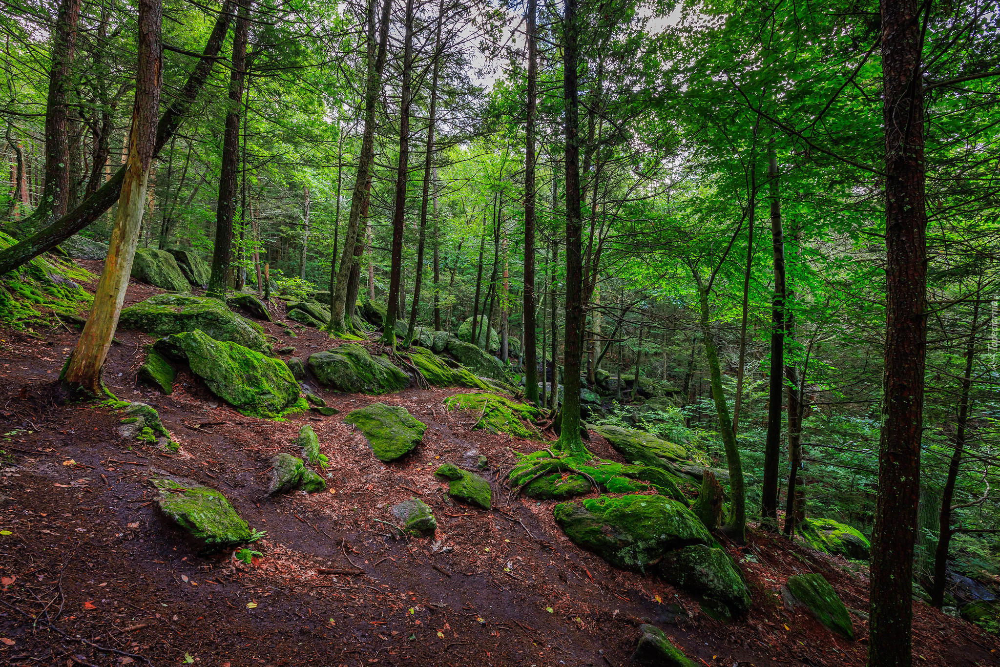 Edytor tapety: Omszałe kamienie pod zielonymi drzewami na zboczu wzgórza