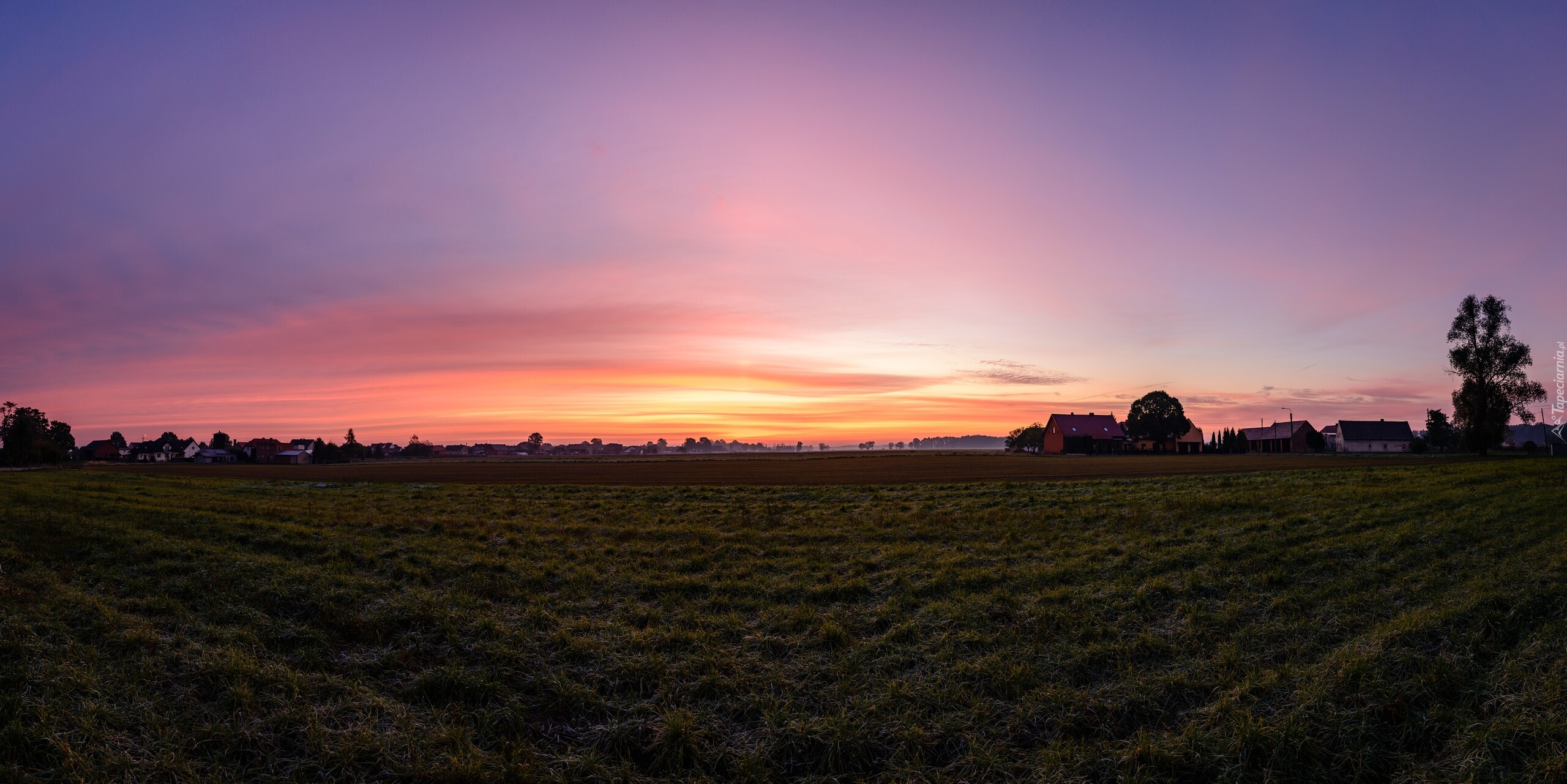 Edytor tapety: Domy i pola pod kolorowym niebem wschodzącego słońca