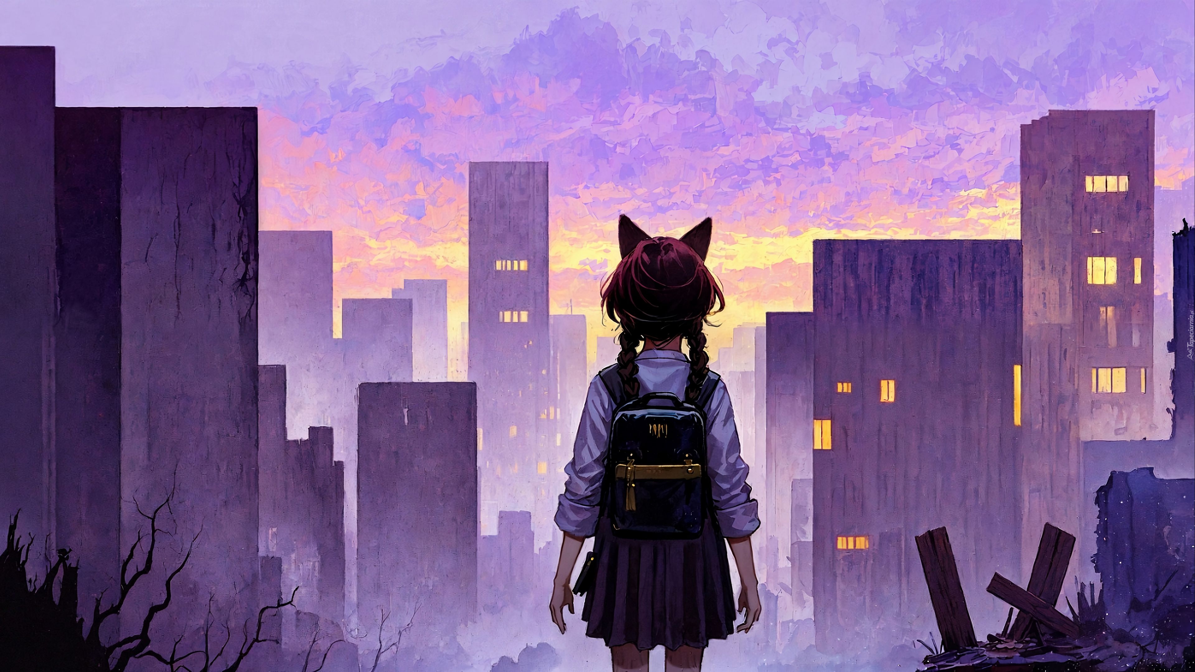 Edytor tapety: Dziewczyna z plecakiem na tle wieżowców w anime
