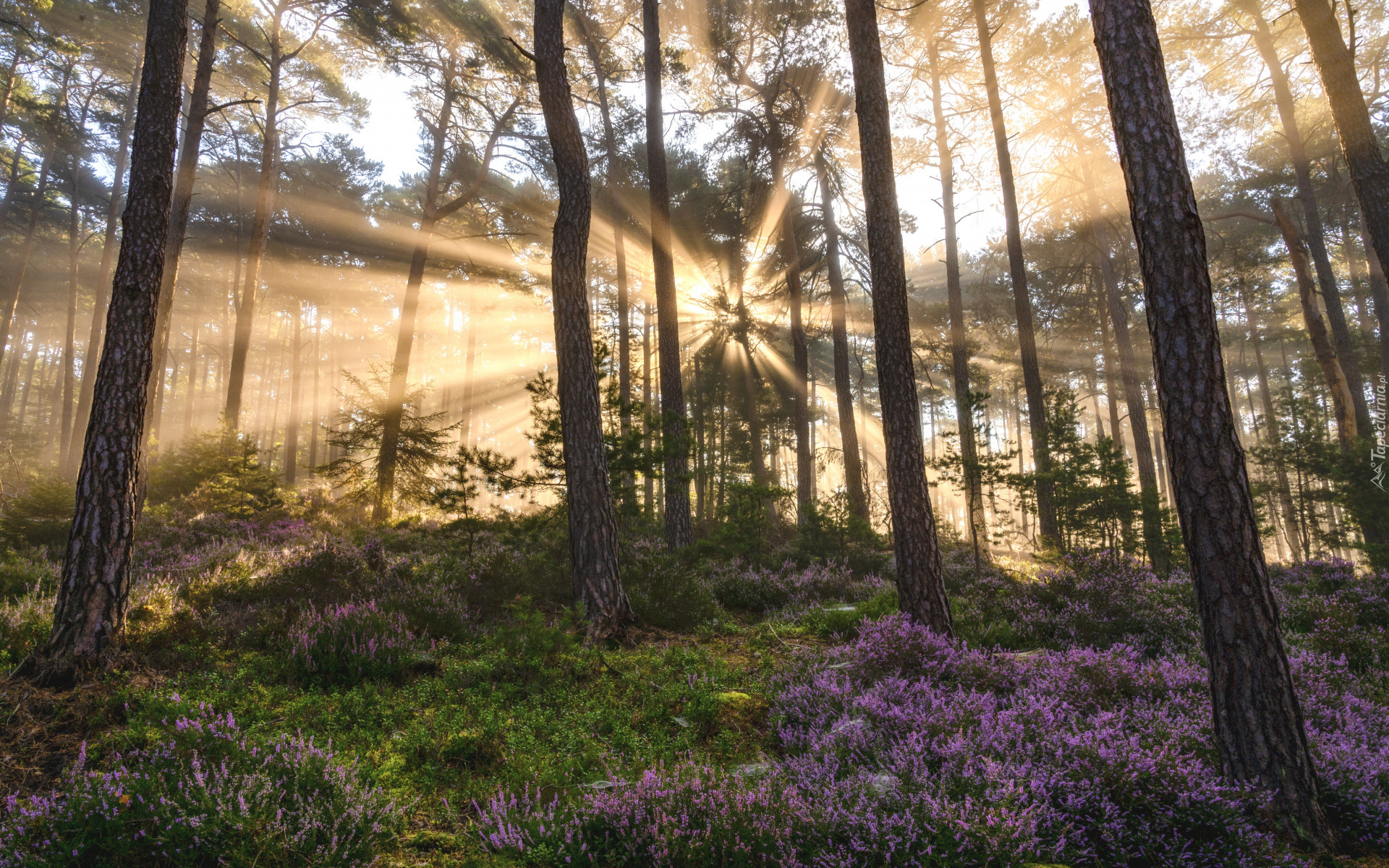 Edytor tapety: Wrzosy pod drzewami w słonecznym lesie