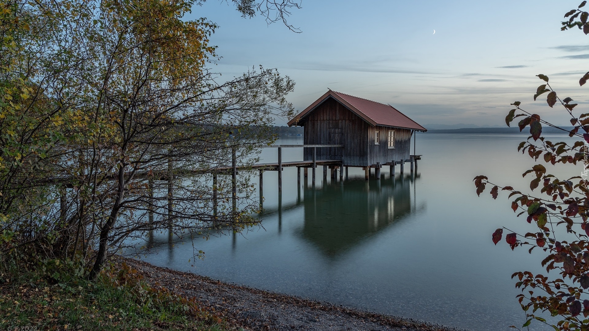 Edytor tapety: Dom na pomoście nad jeziorem