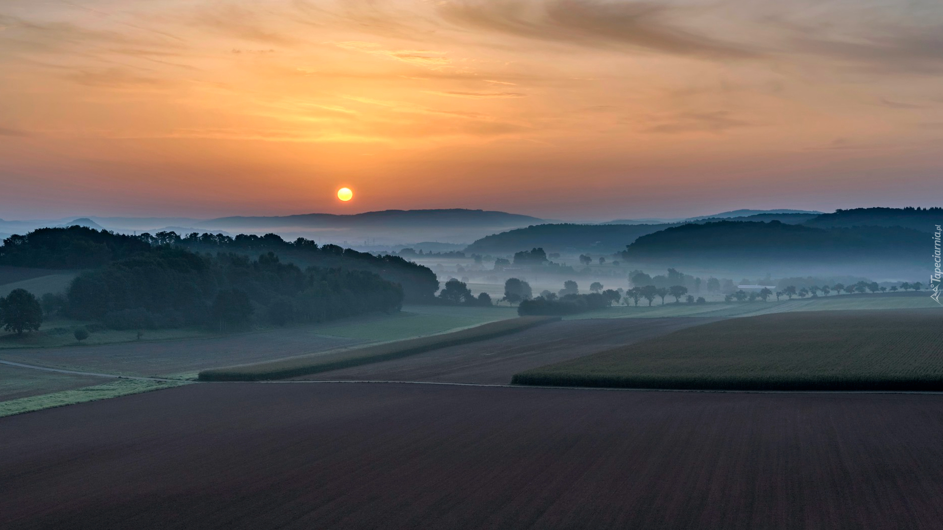 Edytor tapety: Zamglone o wschodzie słońca pola i góry