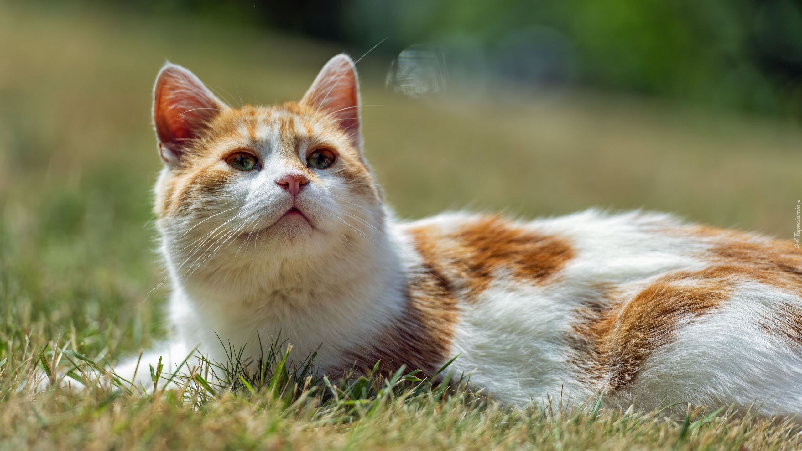 Edytor tapety: Biało-rudy kot odpoczywający w słońcu na trawie
