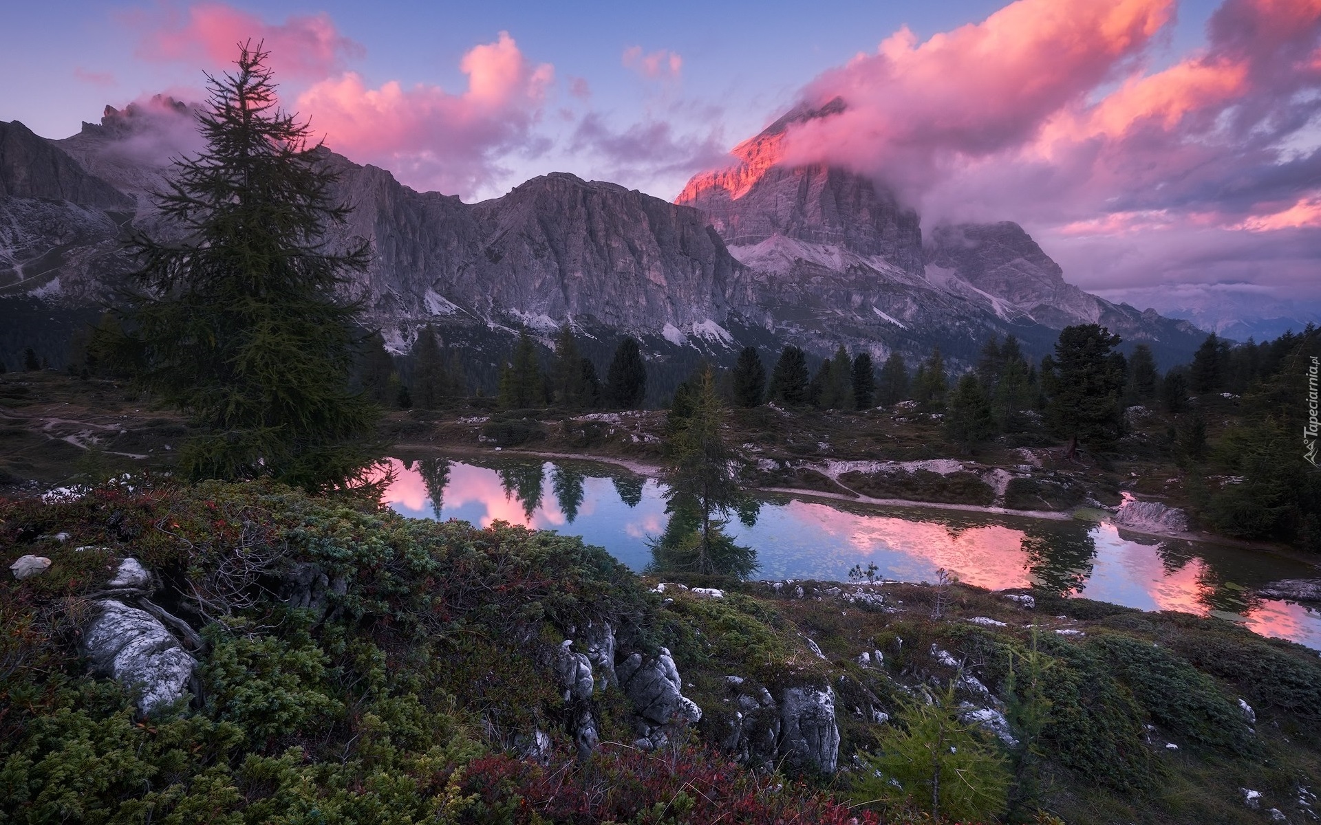 Edytor tapety: Jezioro Lago Limides i kolorowe chmury nad Dolomitami
