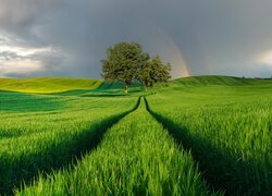 Edytor tapety: Tęcza nad drzewami na zielonym polu