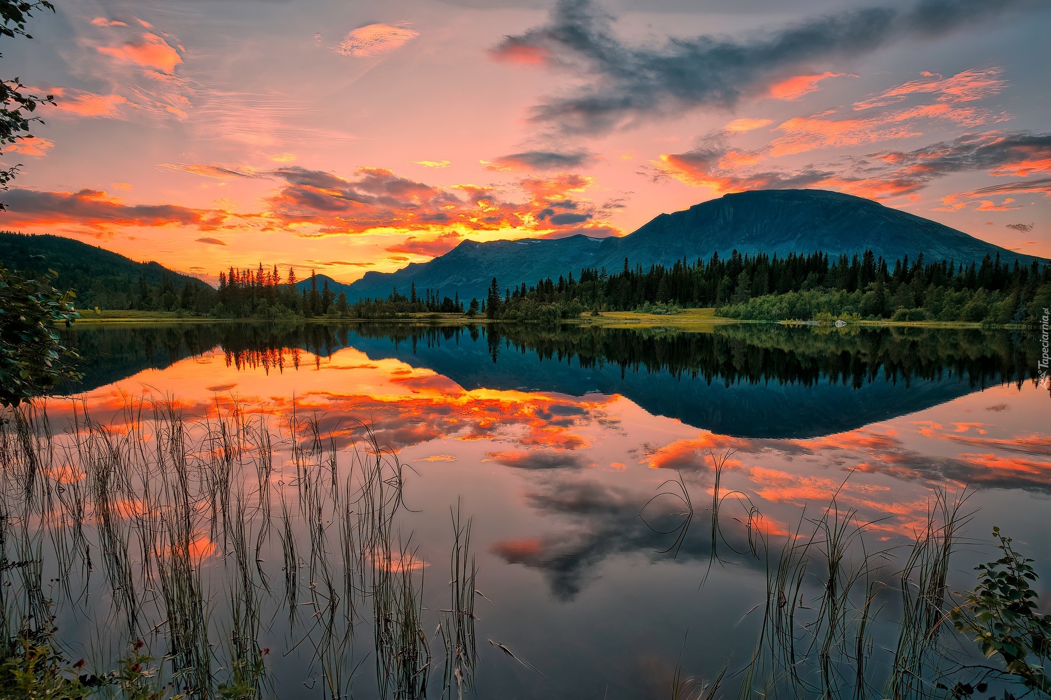 Edytor tapety: Jezioro i góry pod kolorowym niebem zachodzącego słońca
