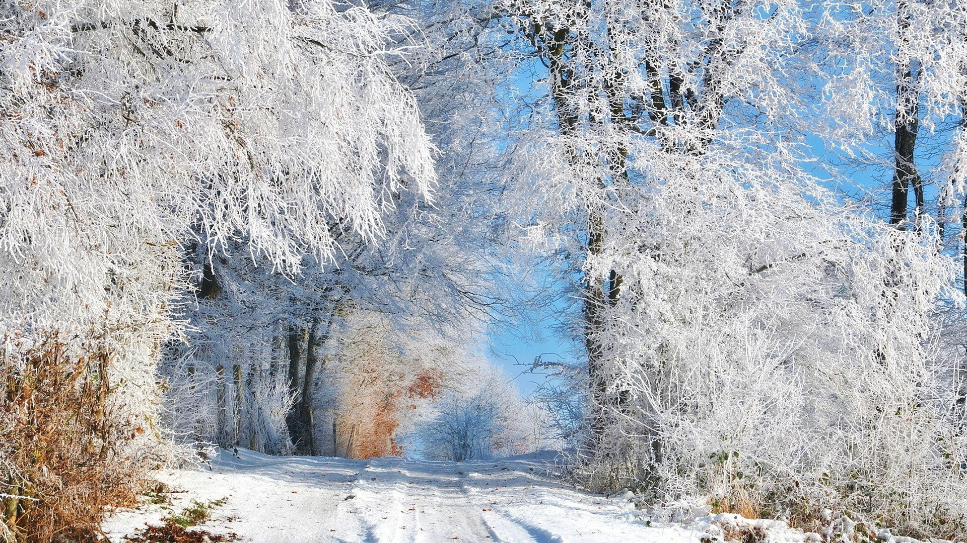 Edytor tapety: Oszronione drzewa przy leśnej drodze zimą