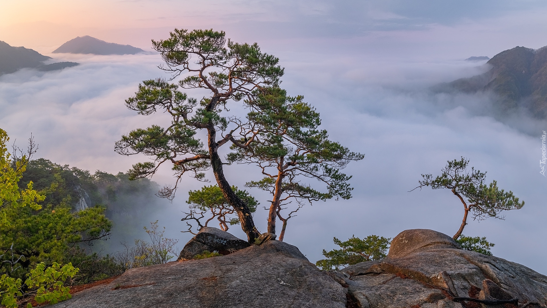 Edytor tapety: Sosny i góry we mgle