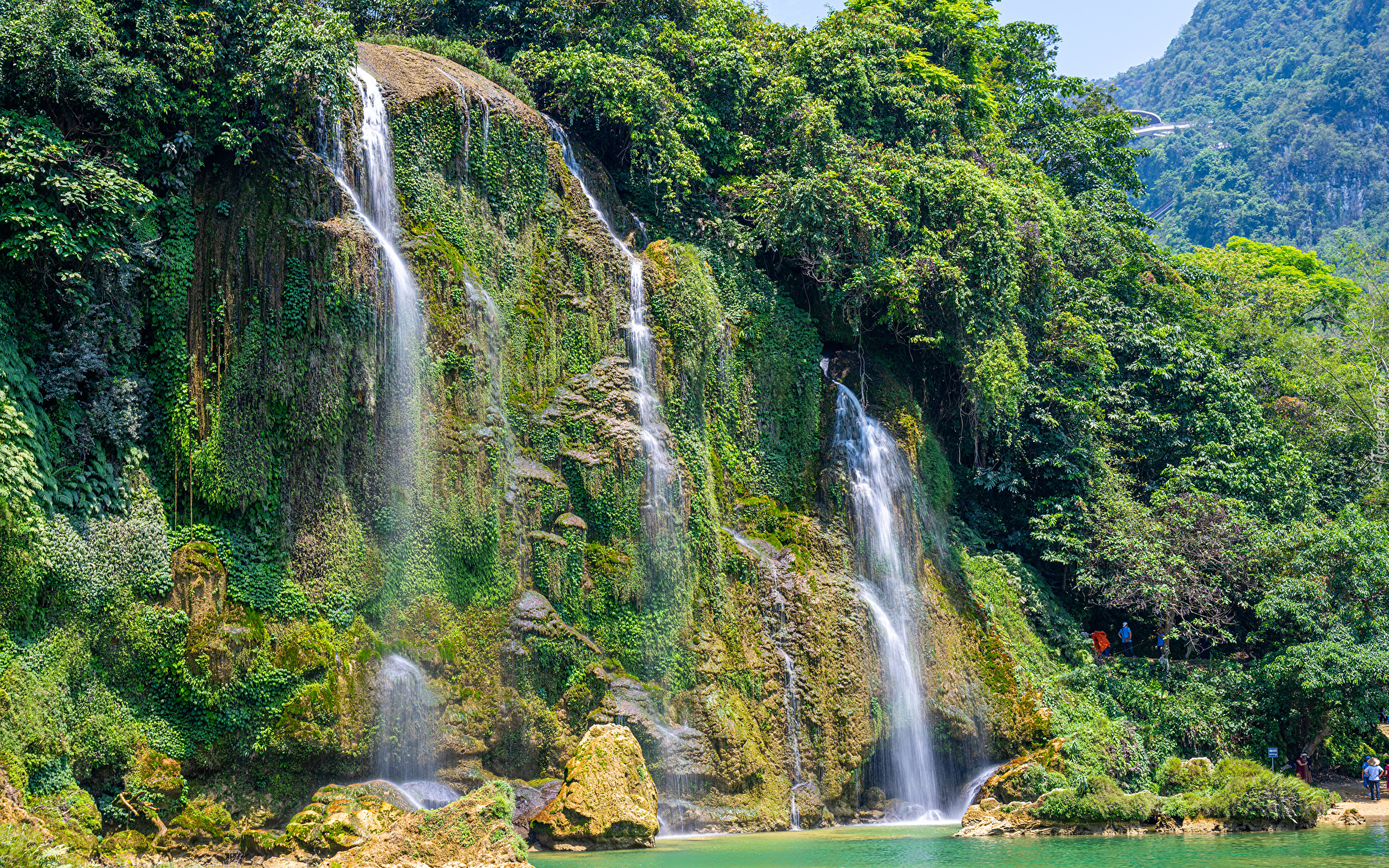 Edytor tapety: Drzewa przy wodospadzie i zielona roślinność