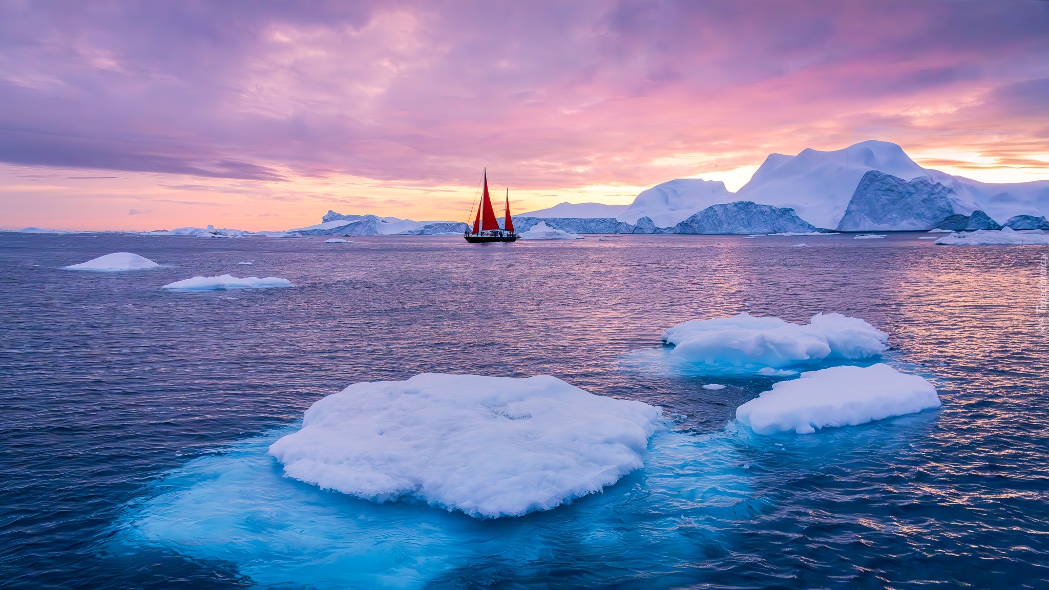 Edytor tapety: Żaglówka i kry lodowe na morzu w Grenlandii