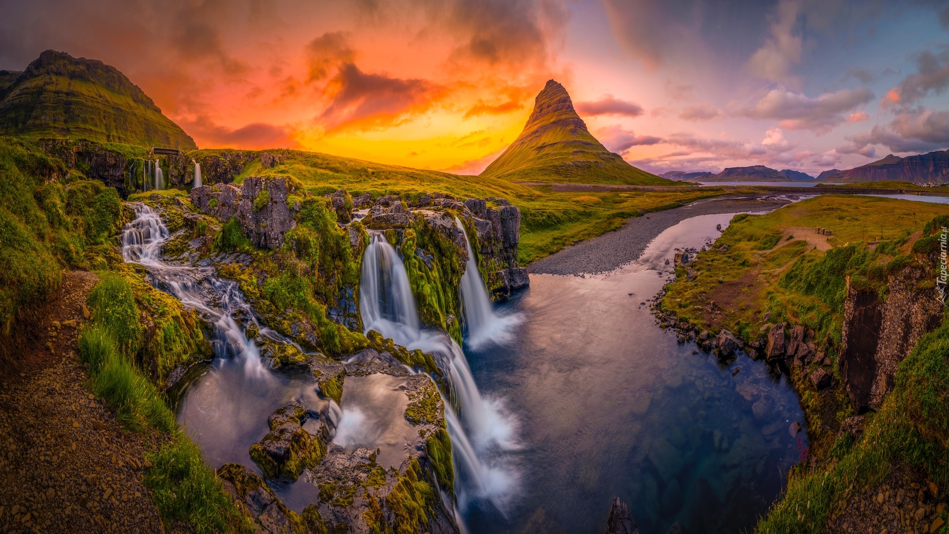 Edytor tapety: Wodospad Kirkjufellsfoss i góra Kirkjufell o zachodzie słońca