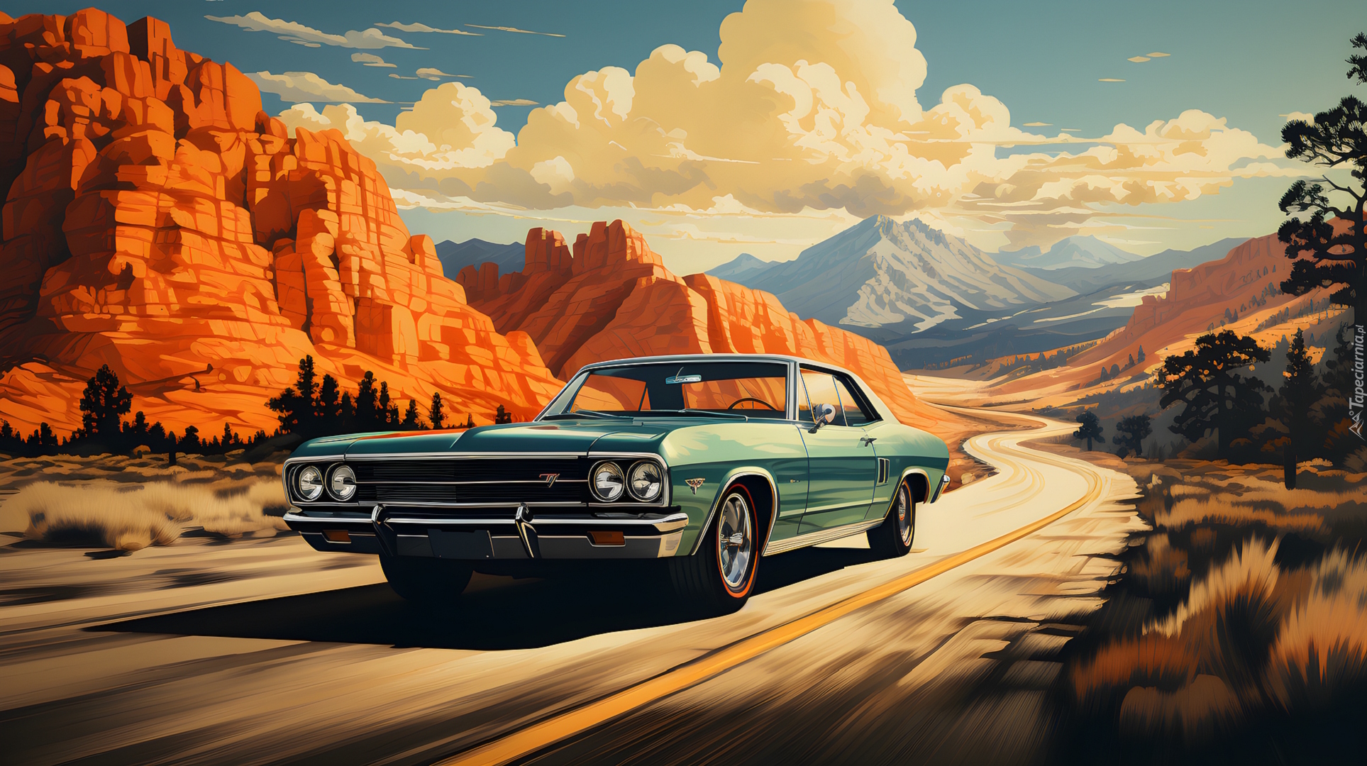 Edytor tapety: Samochód na drodze na tle gór w grafice