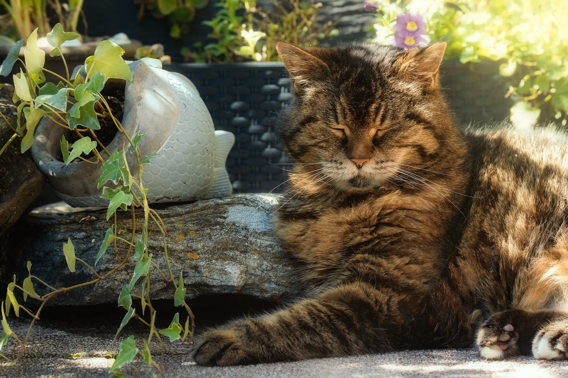 Edytor tapety: Śpiący bury kot w ogrodzie