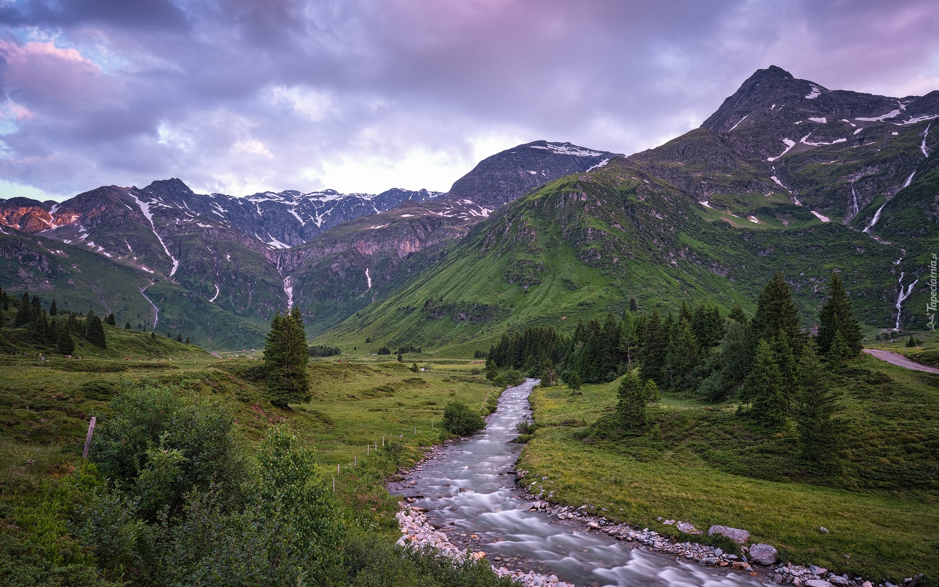 Edytor tapety: Rzeka i góry pod chmurami